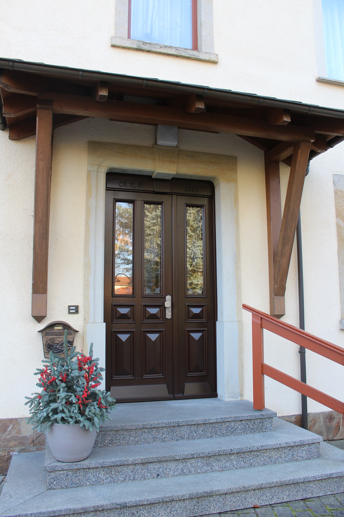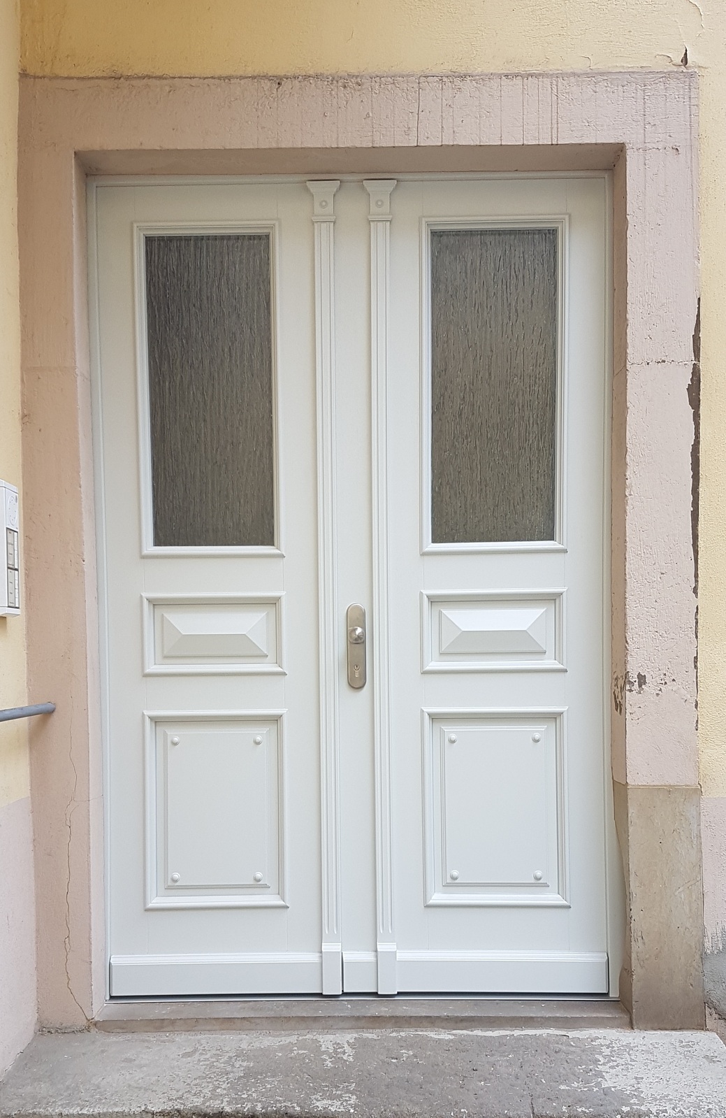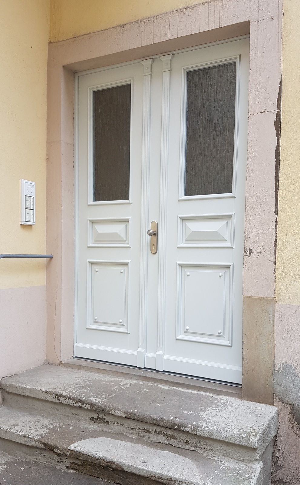 2 flüglige Haustür mit versetztem Mittelschluss in einem Mehrfamilienhaus, optisch angepasst an vorherige Tür, in Pirna