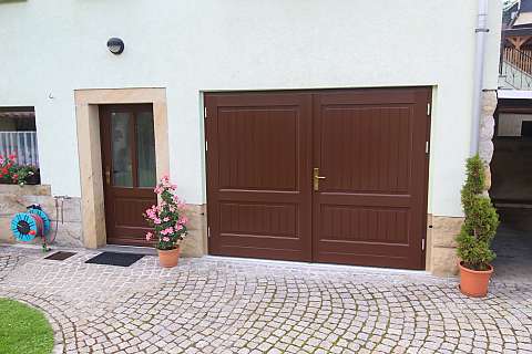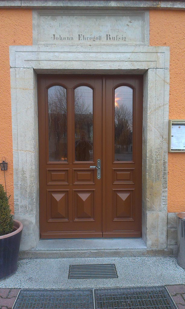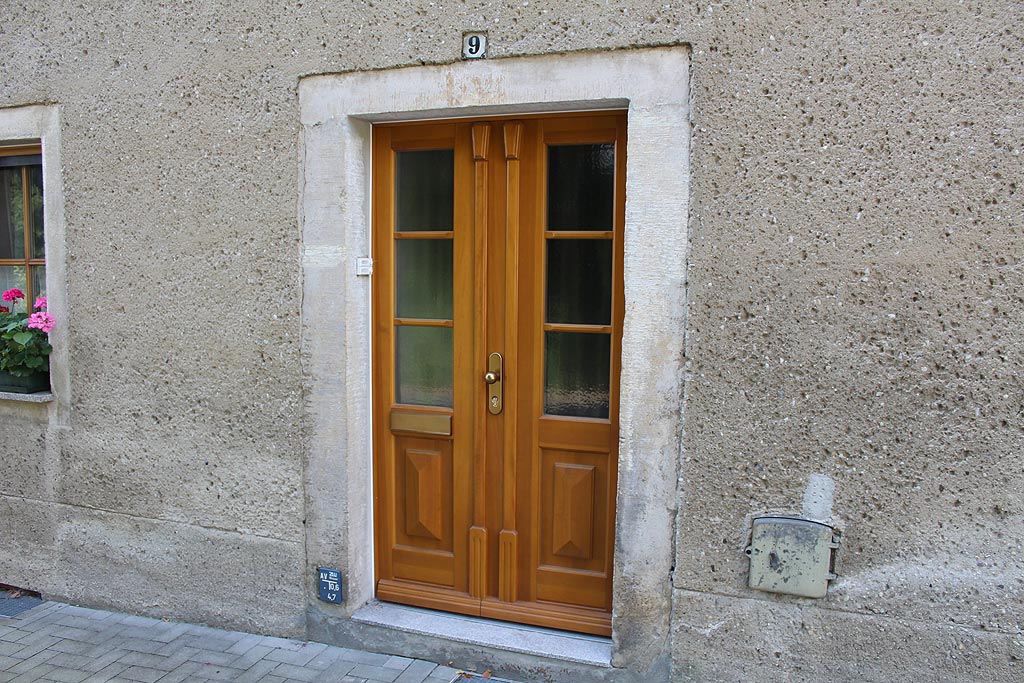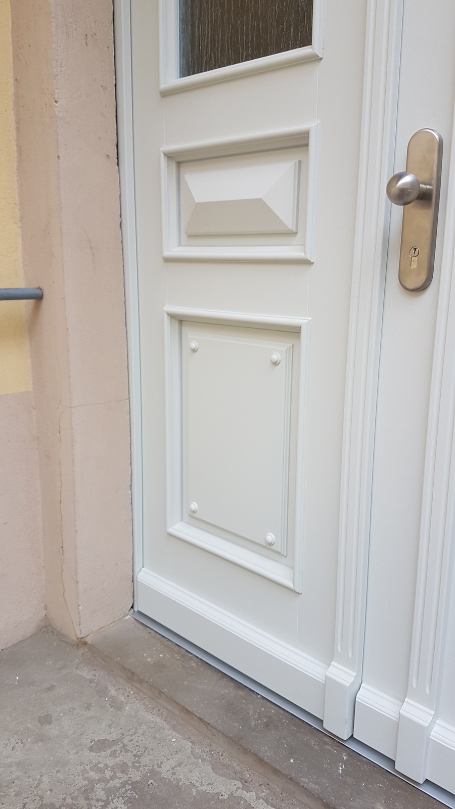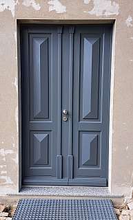 2 flüglige Haustür mit versetztem Mittelschluss in einem Mehrfamilienhaus, optisch angepasst an vorherige Tür, in Pirna