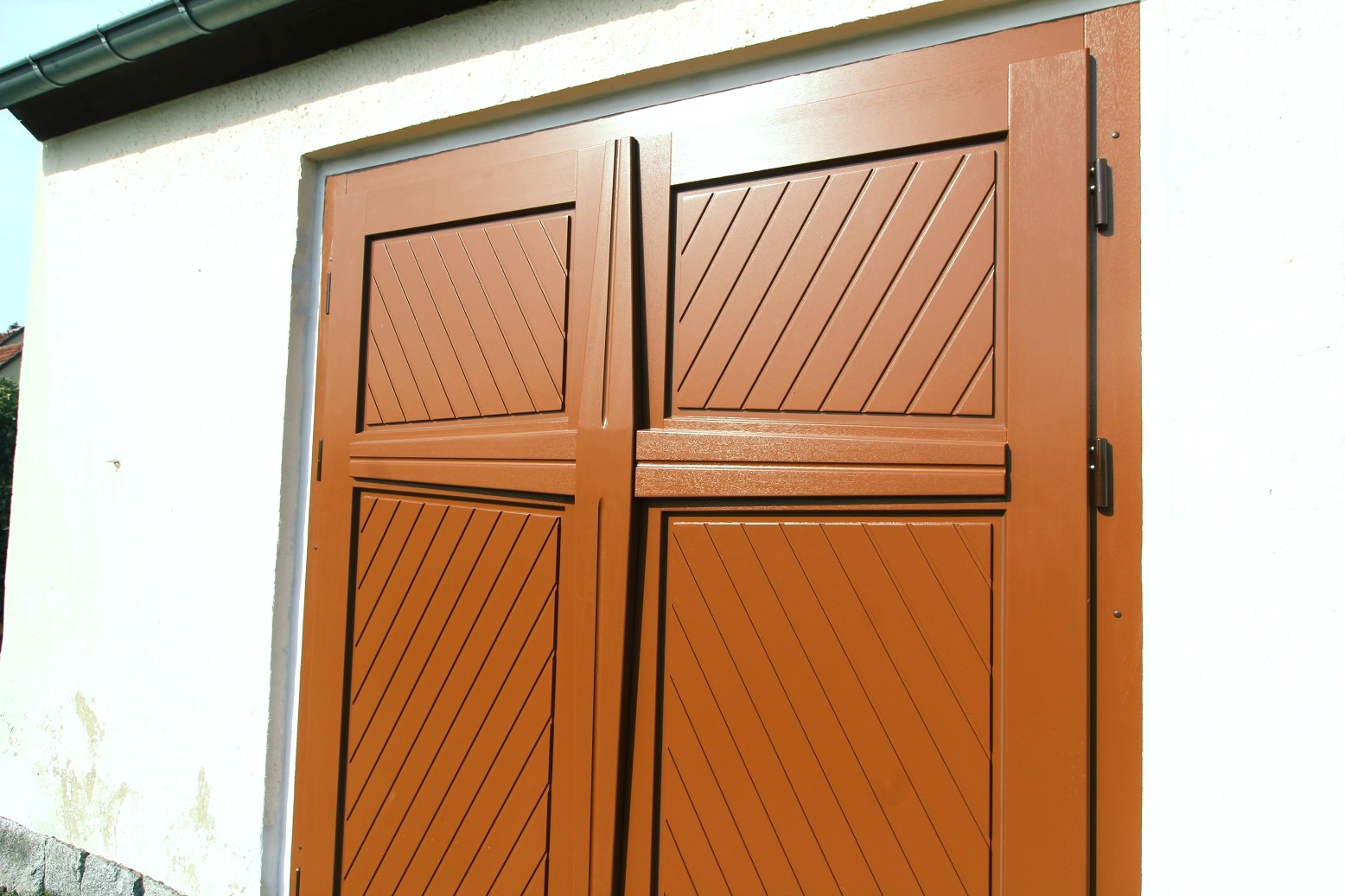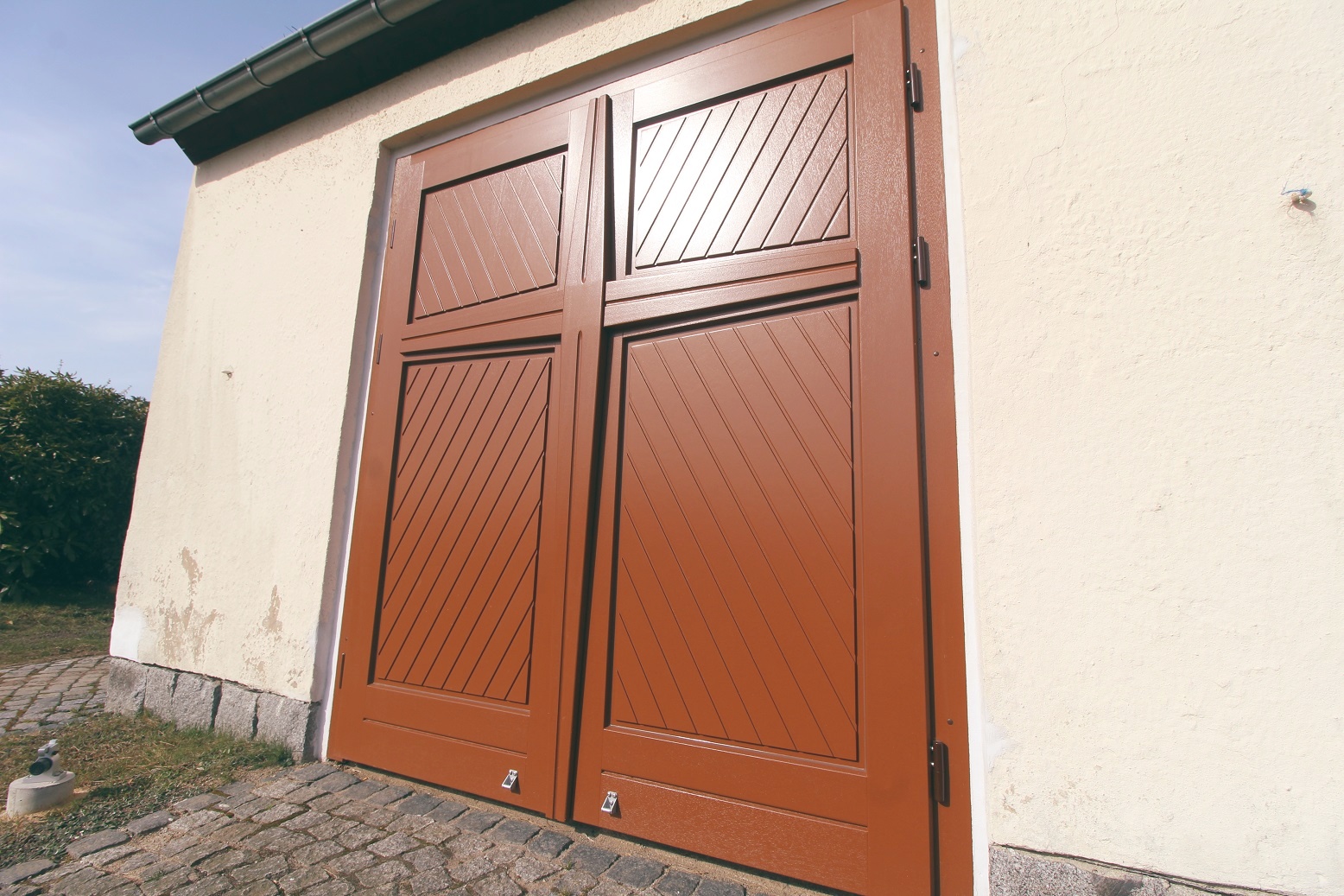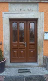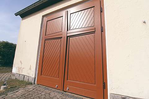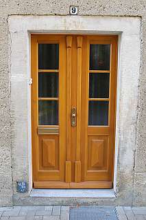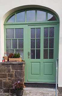 zweiflüglige Tür mit versetztem Mittelschluss - die Tür erscheint symetrisch, beim öffnen des rechten Hauptflügels ergibt sich ein größerer Durchgang, Einbauort Neustadt