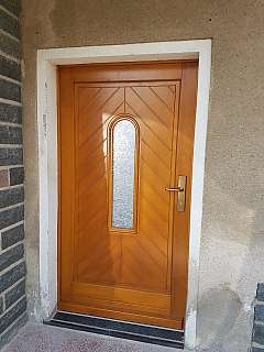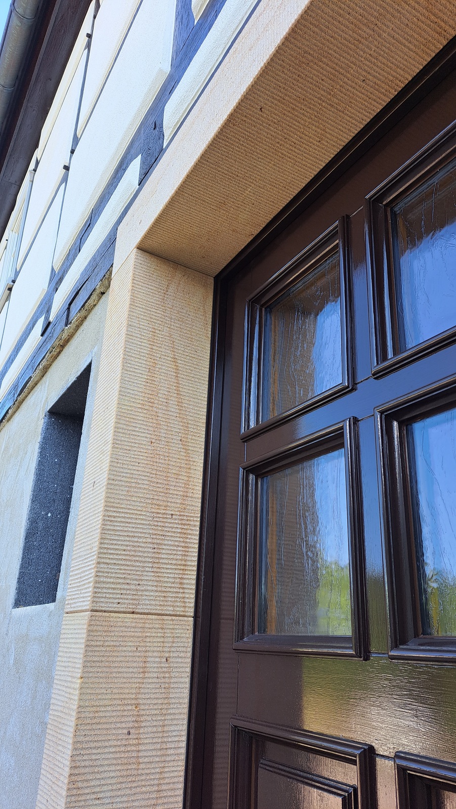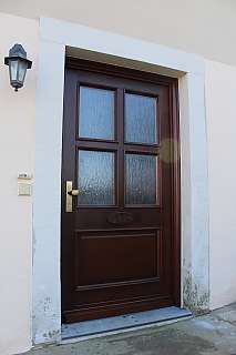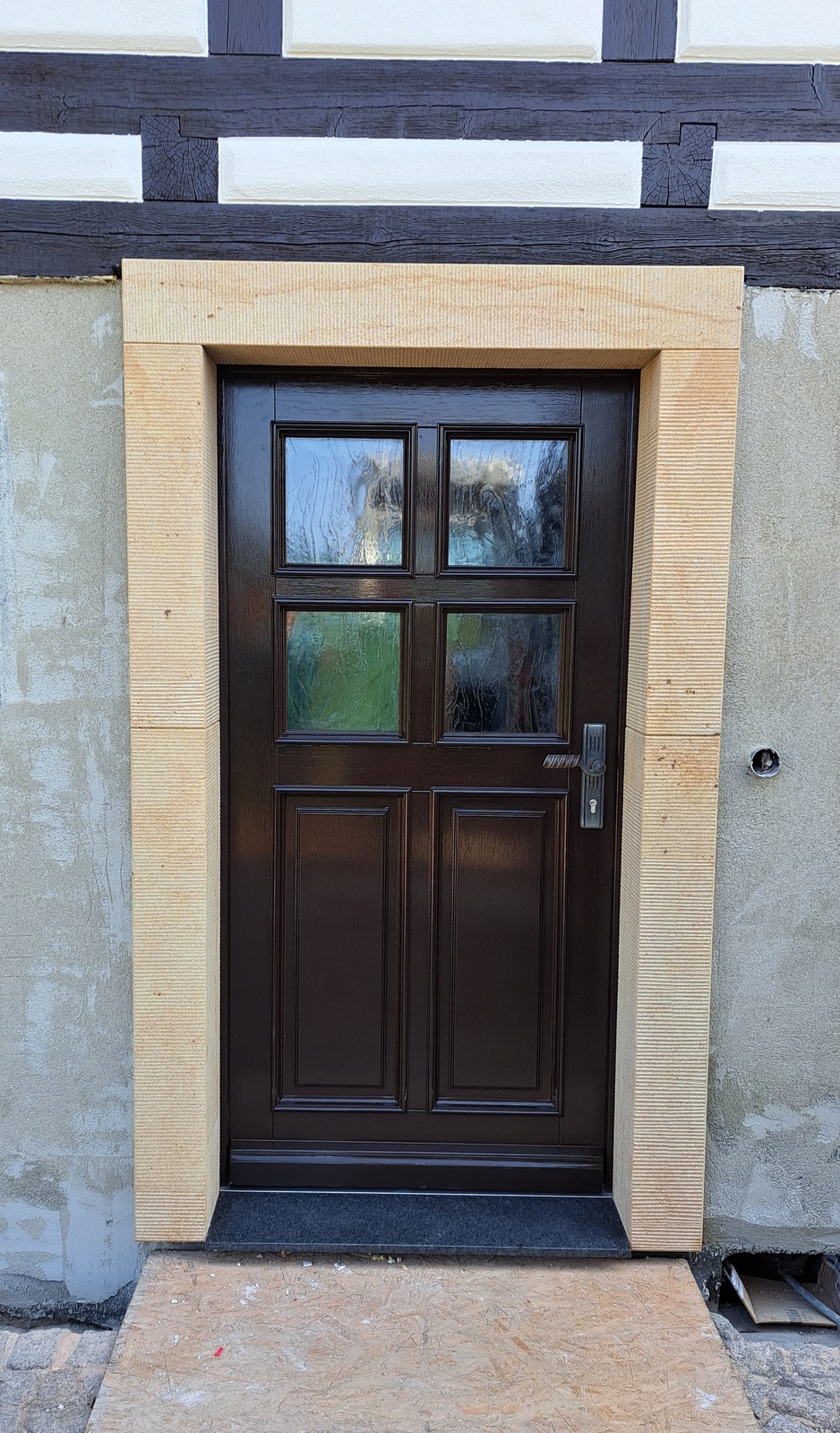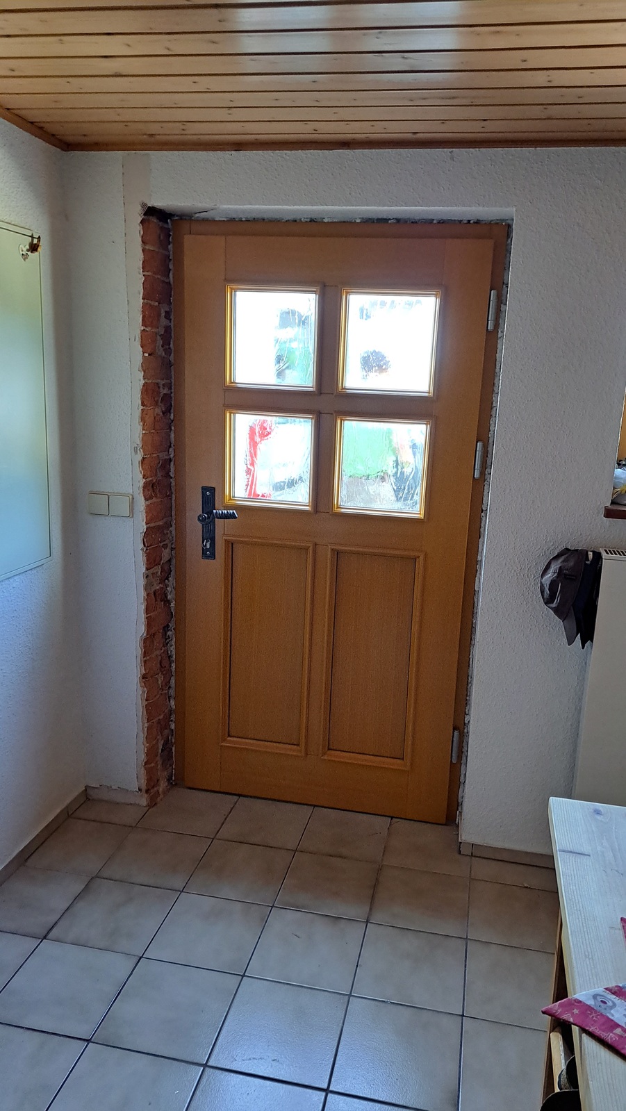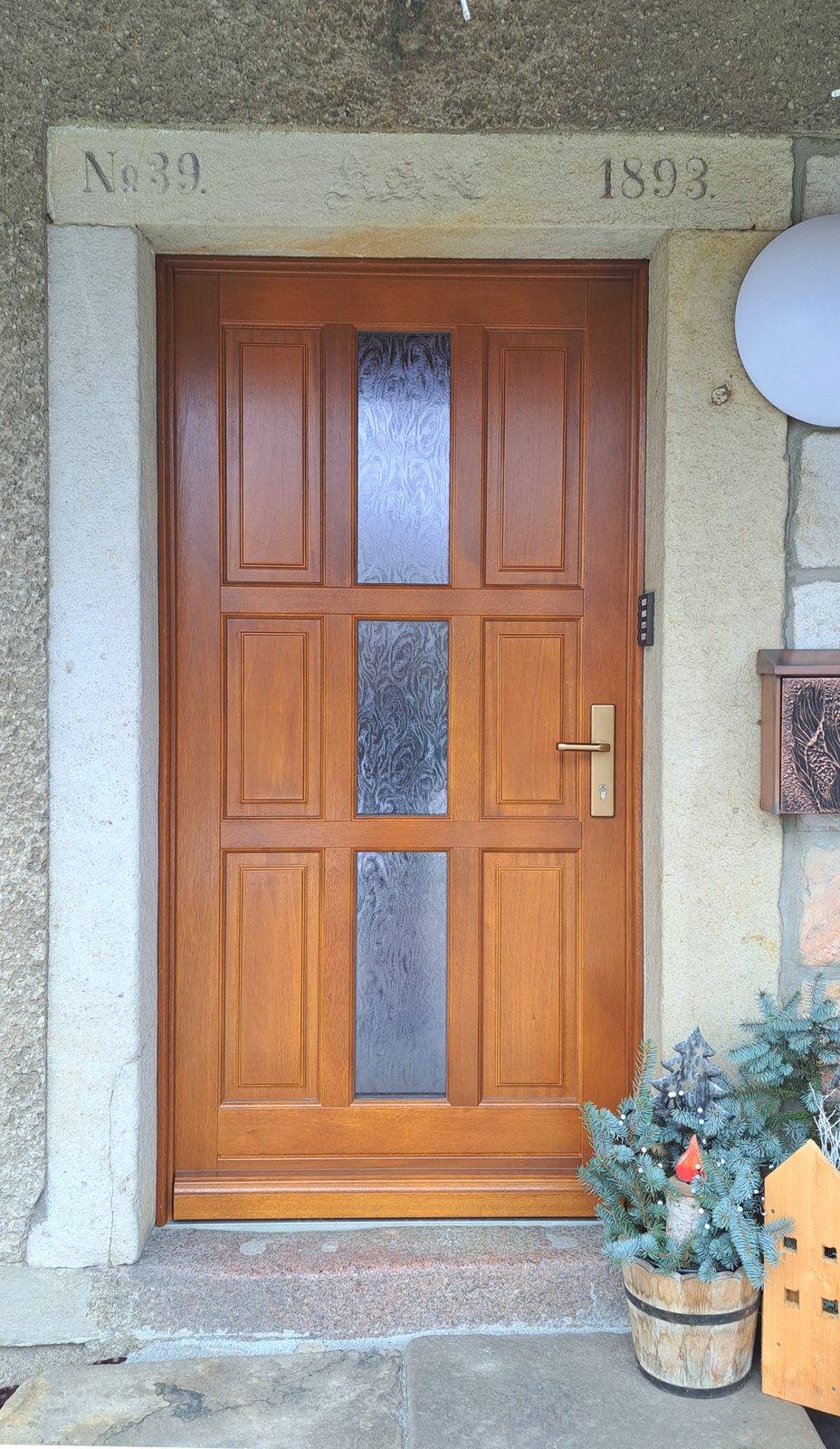 Eine klassische Haustür aus sibirischer Lärche in einem Fachwerkhaus, die Oberfläche (geölt) führten die Kunden selbst bei uns in der Werkstatt durch, Einbauort Krumhermsdorf