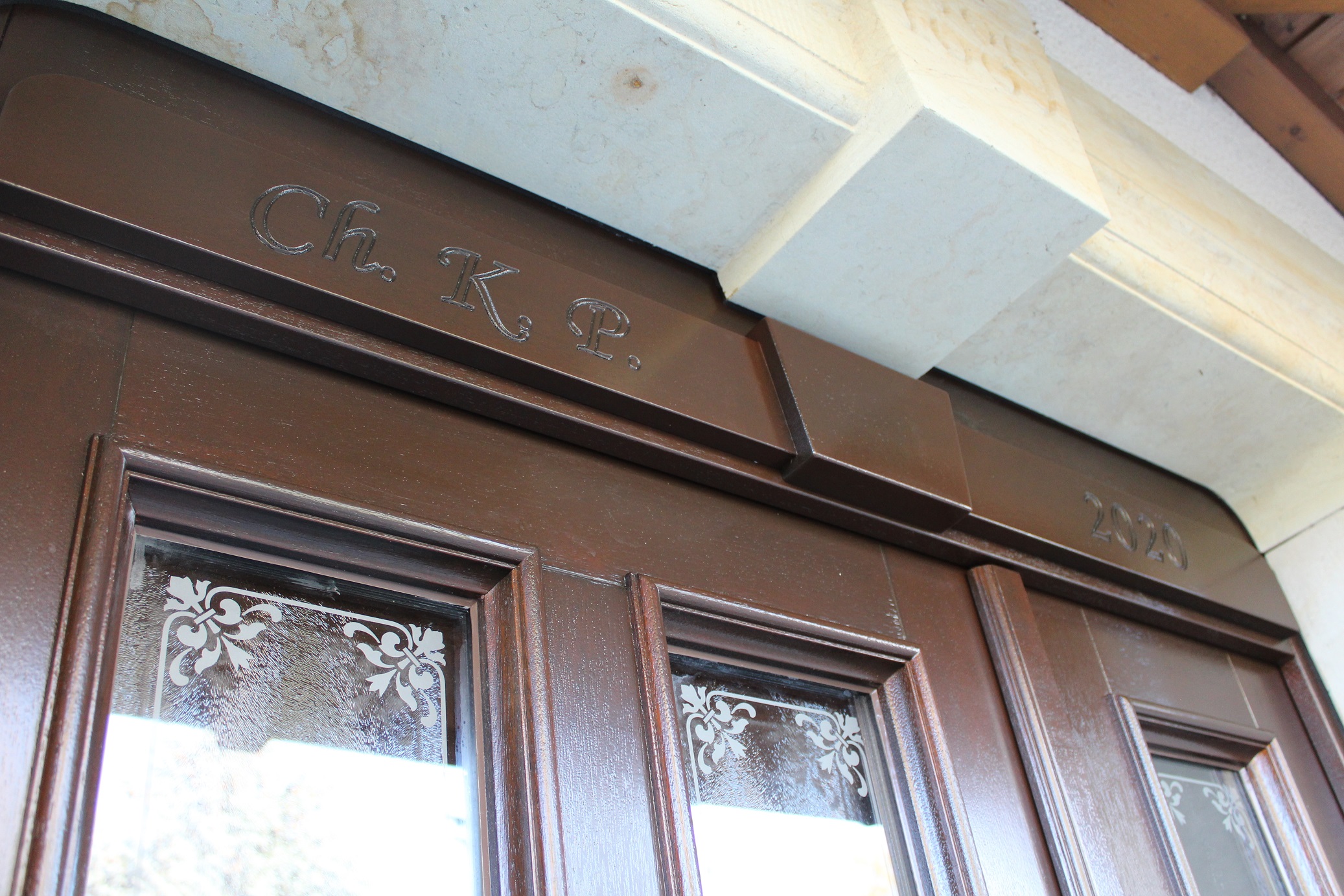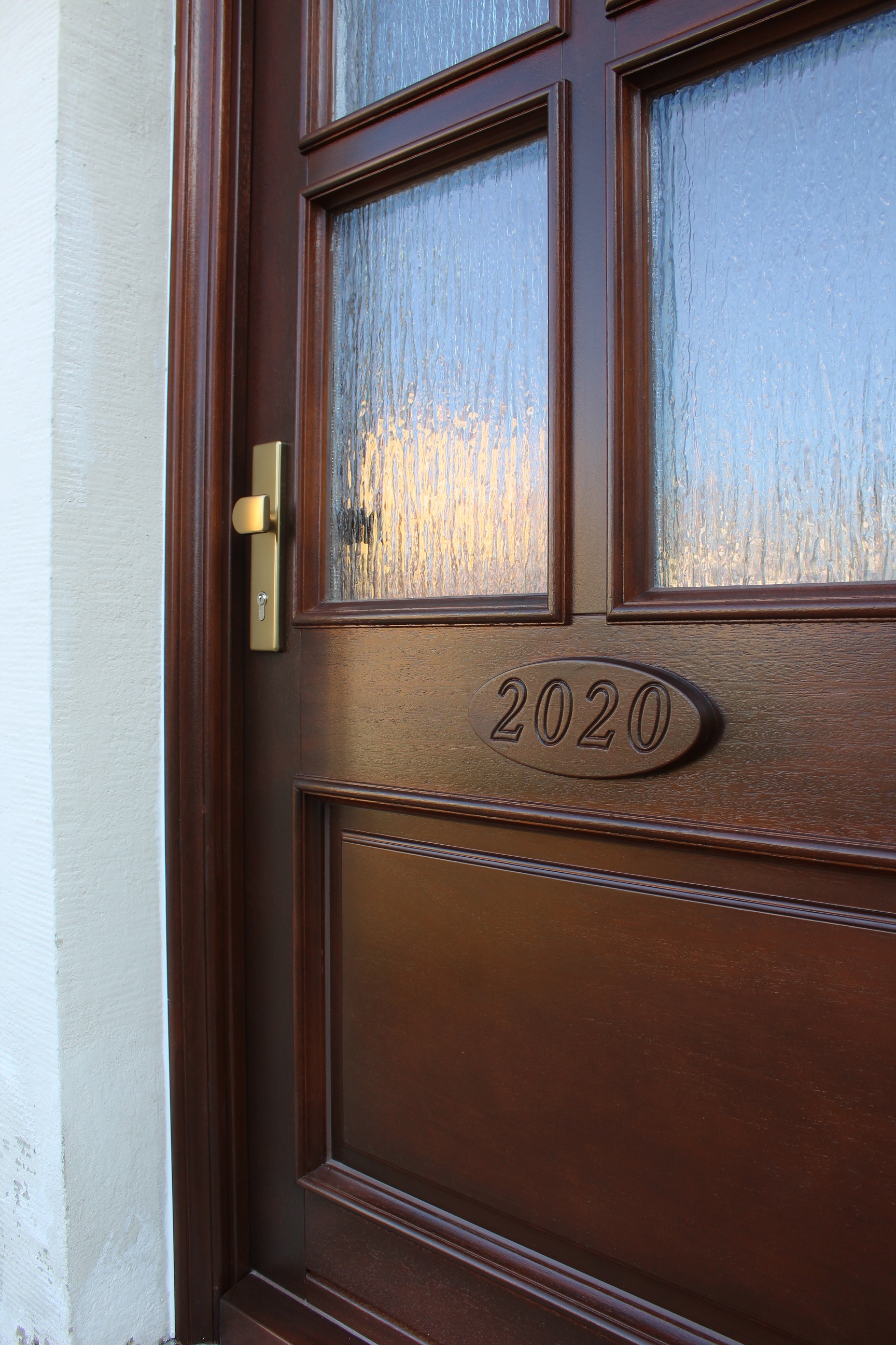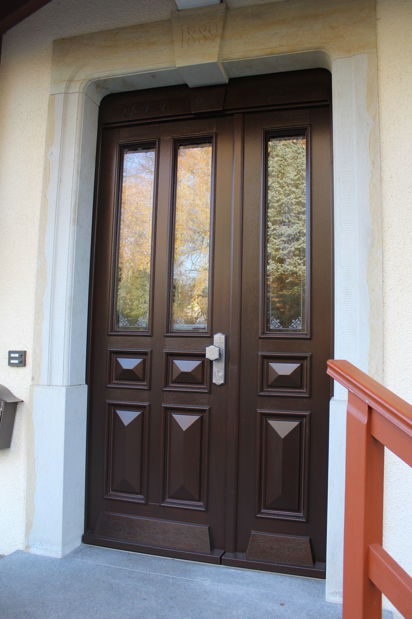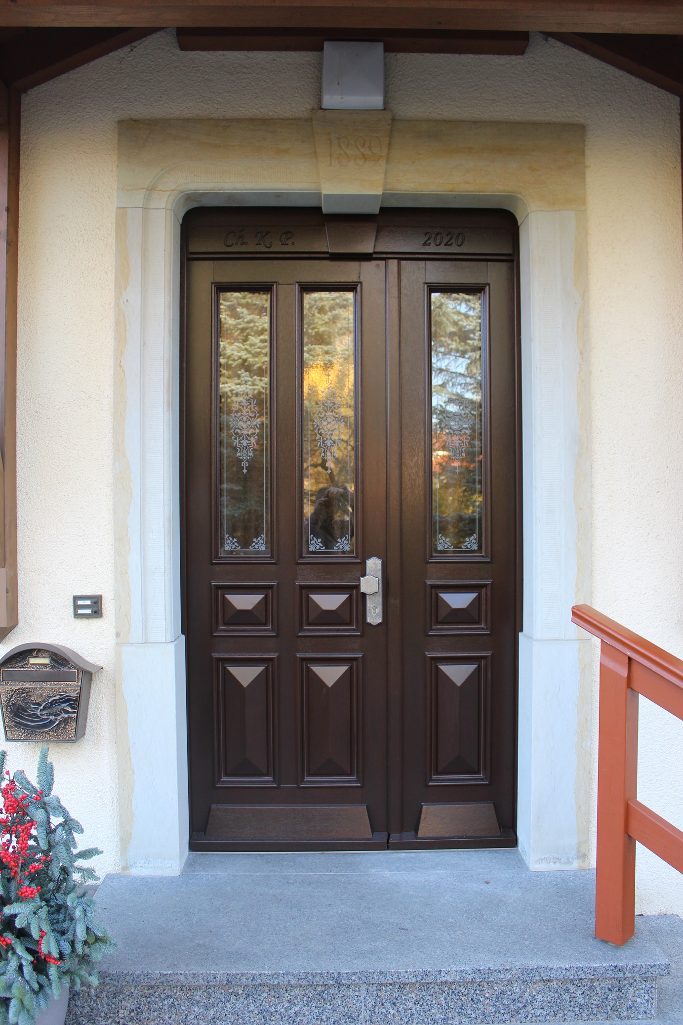 hochwertige 2-flüglige Tür eines Privathauses mit Gravur von Initialen und Baujahr sowie edlem Glasmotiv in Polenz