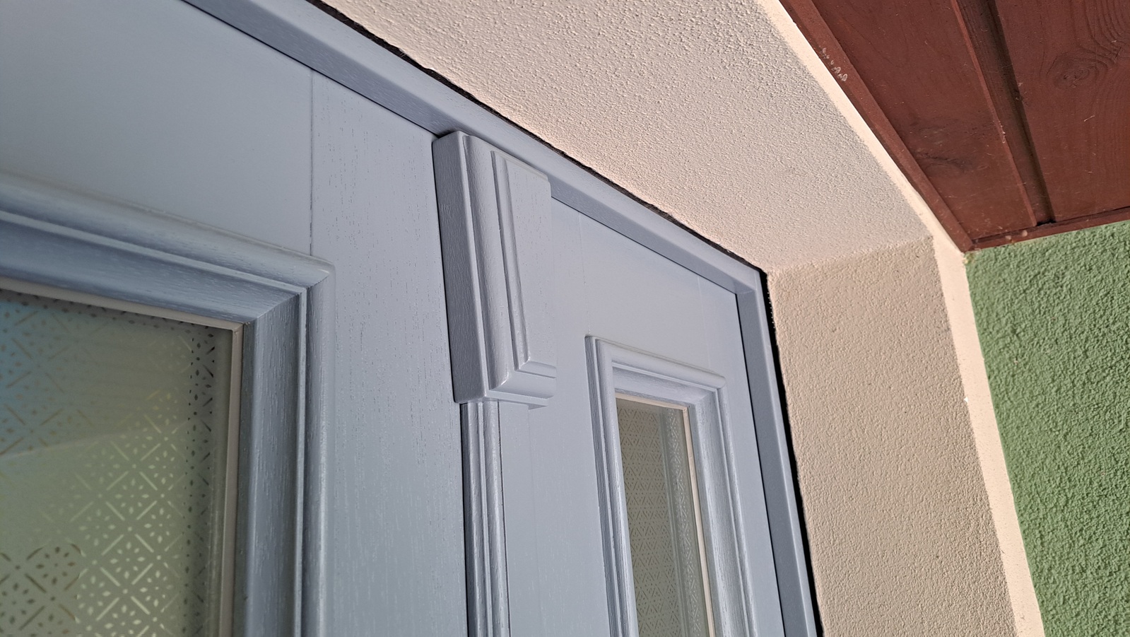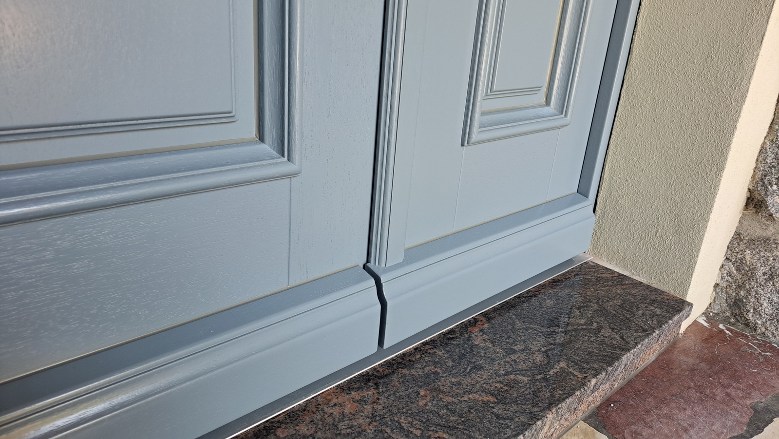 repräsentative 2 flüglige Eingangstür mit versetztem Mittelschluss, Zierprofilen und Füllungen in Pyramidenform aus Meranti grau lackiert in Langburkersdorf