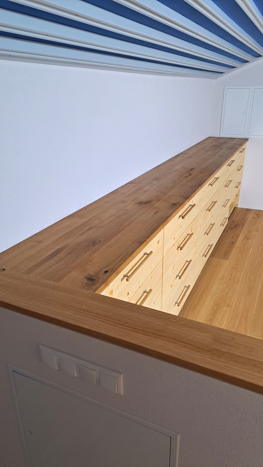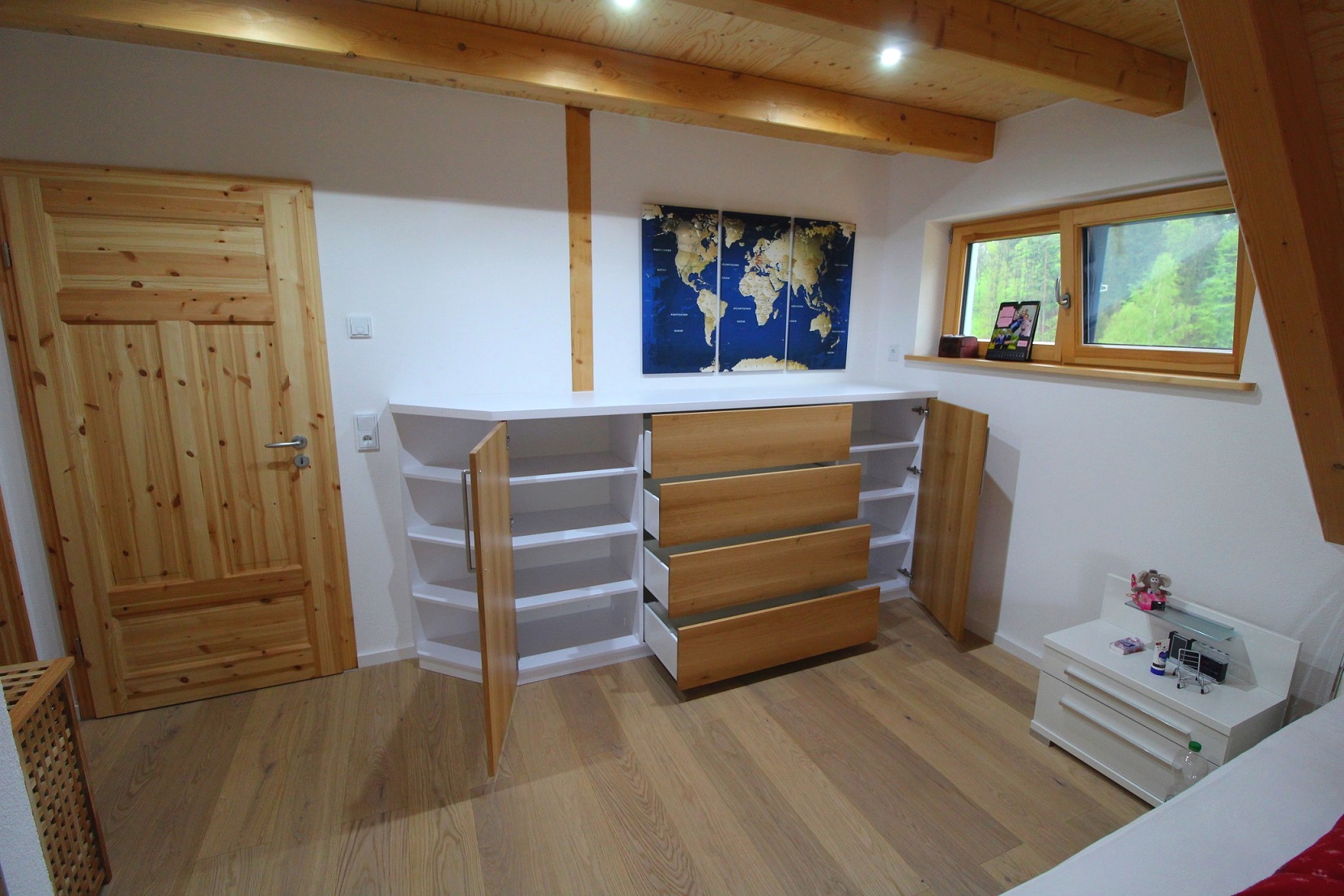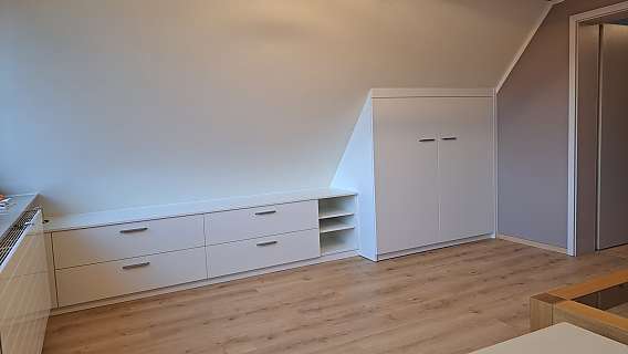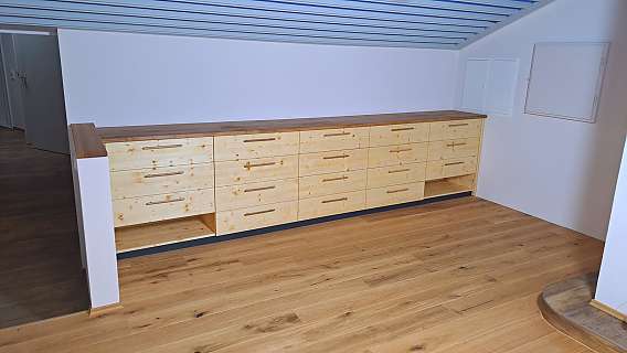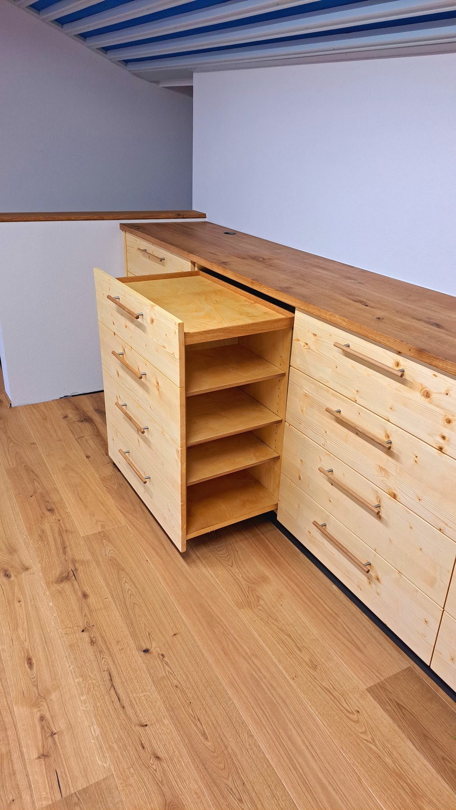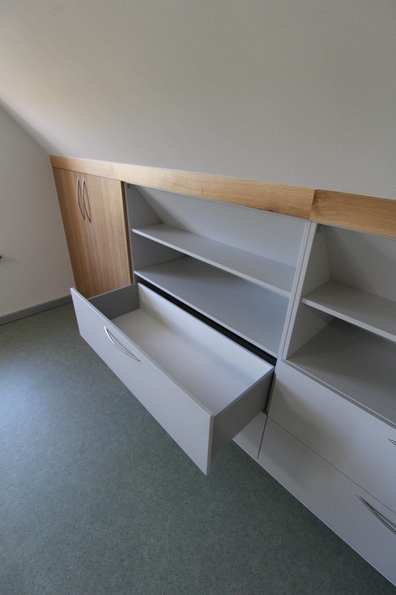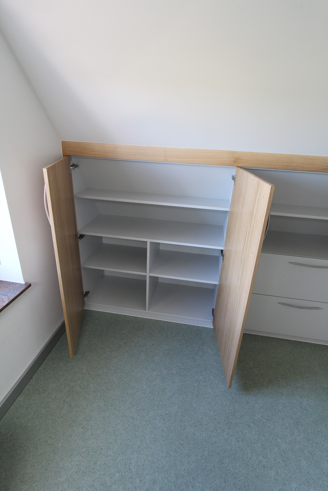 Anfertigung eines Dachschrägenschrankes mit Inneneinteilung nach Kundenwunsch sowie ein Sideboard mit 7 großen Schubkästen