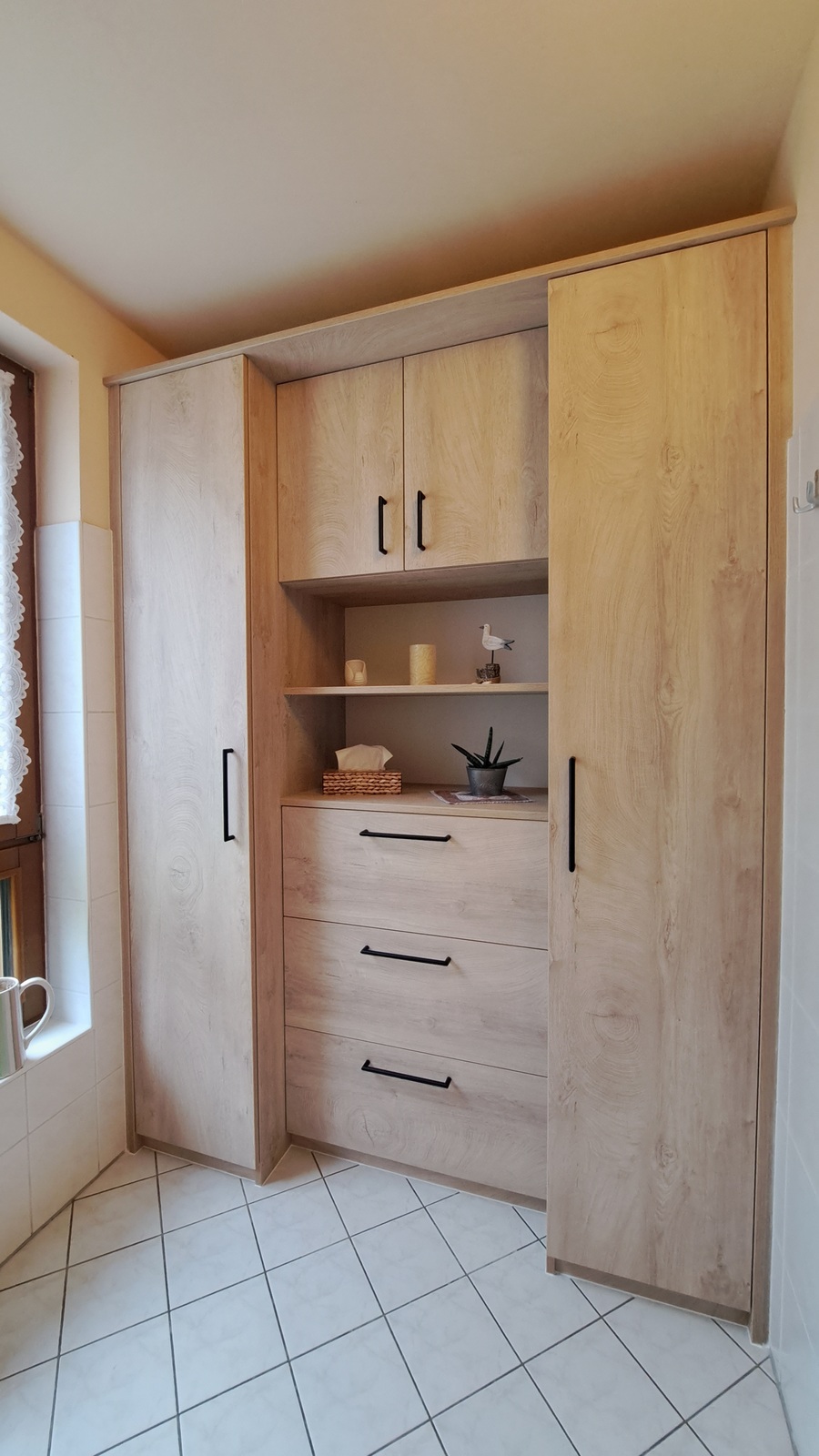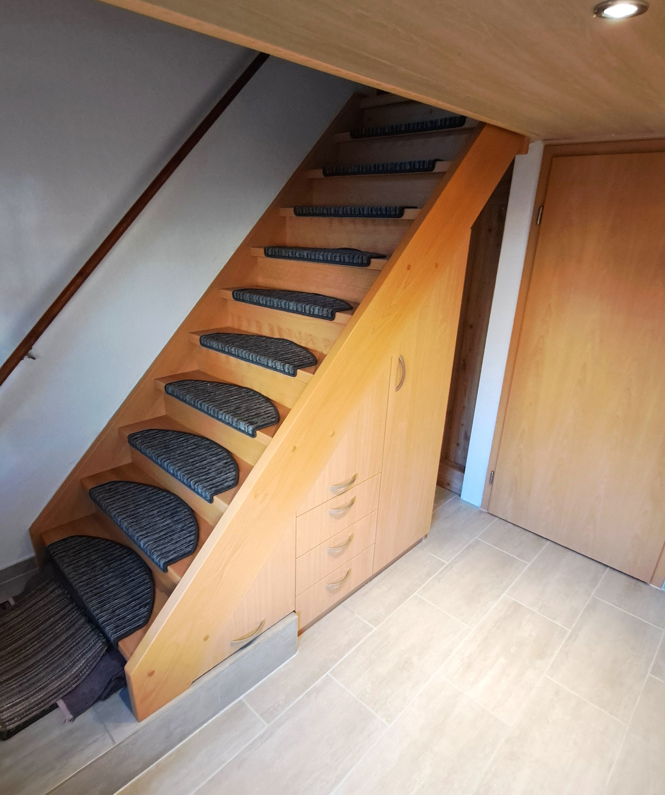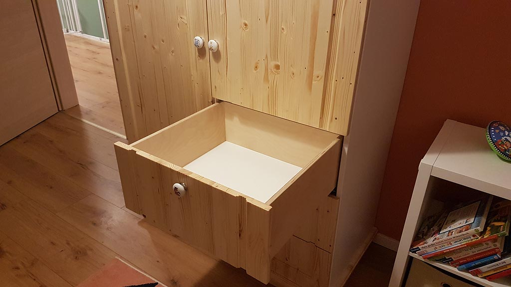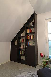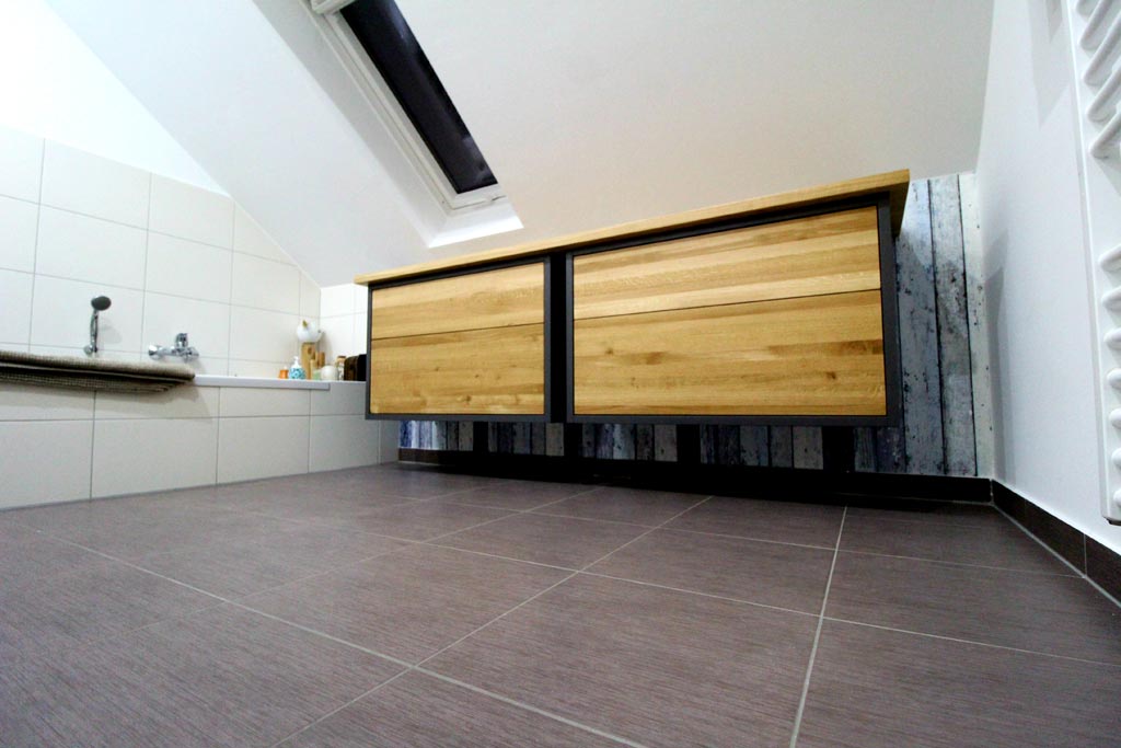 großer Stauraumschrank und Sideboard mit tiefen Schubkästen, angepasst an Dachschräge und schiefen Fußboden