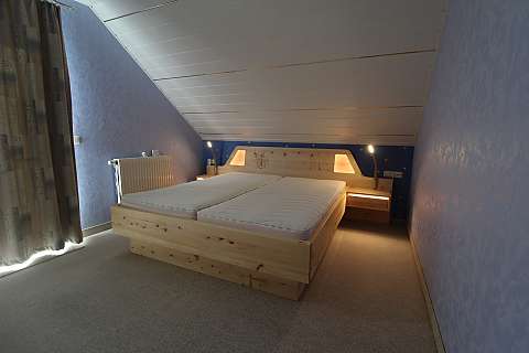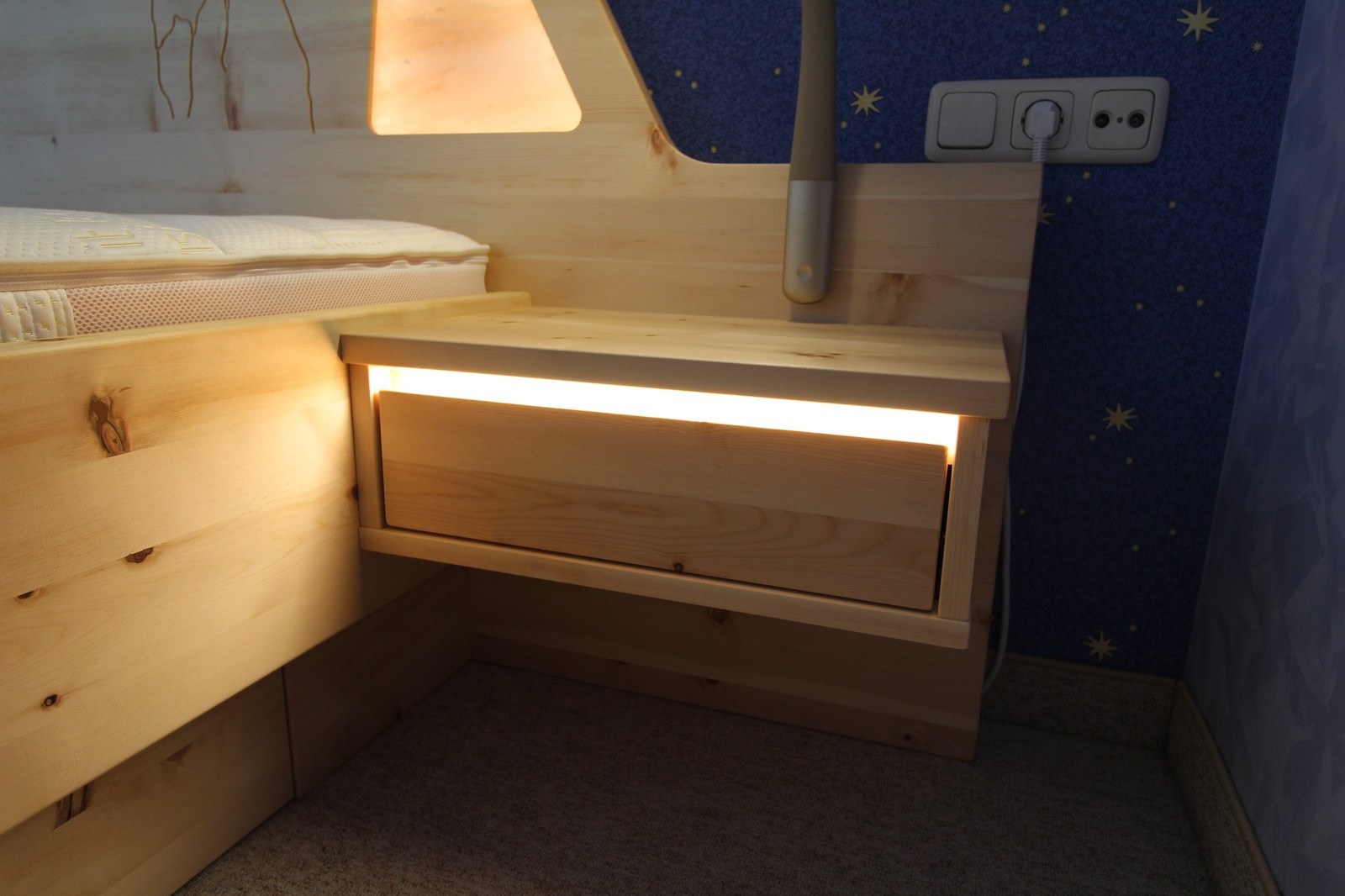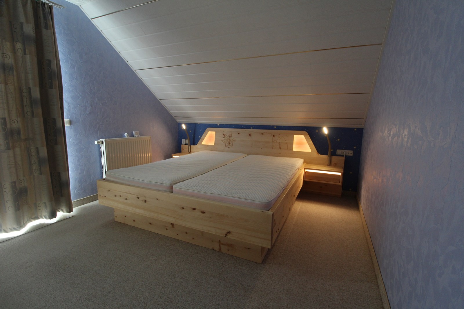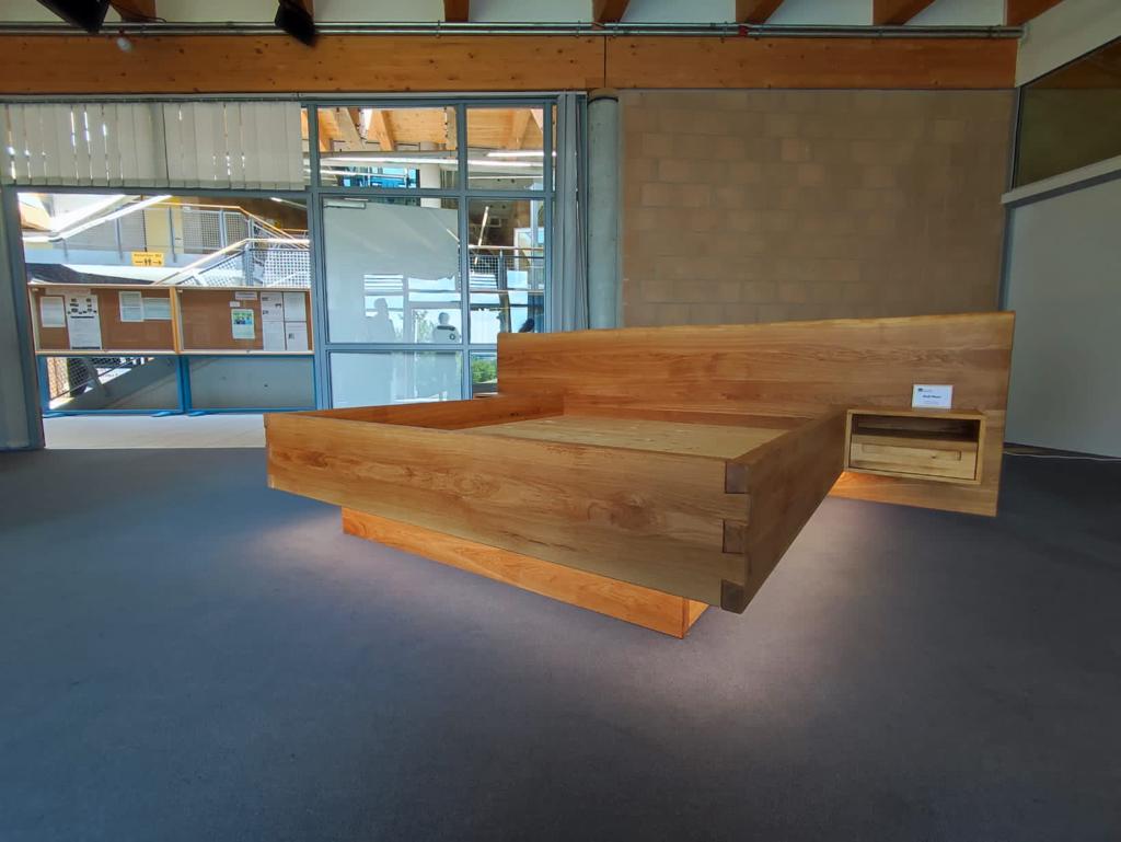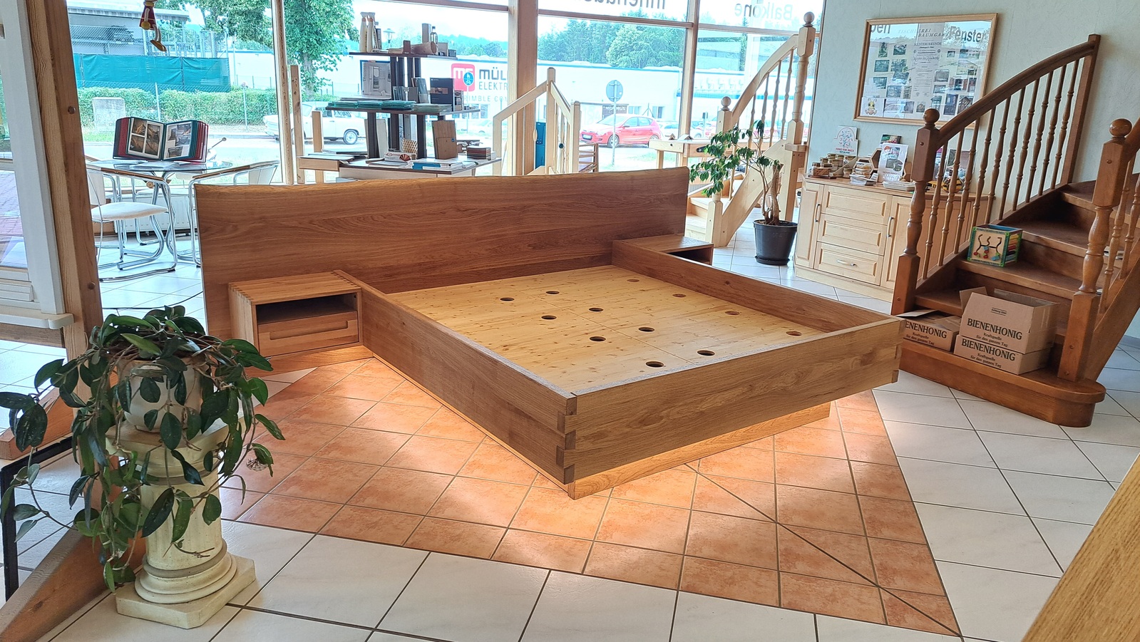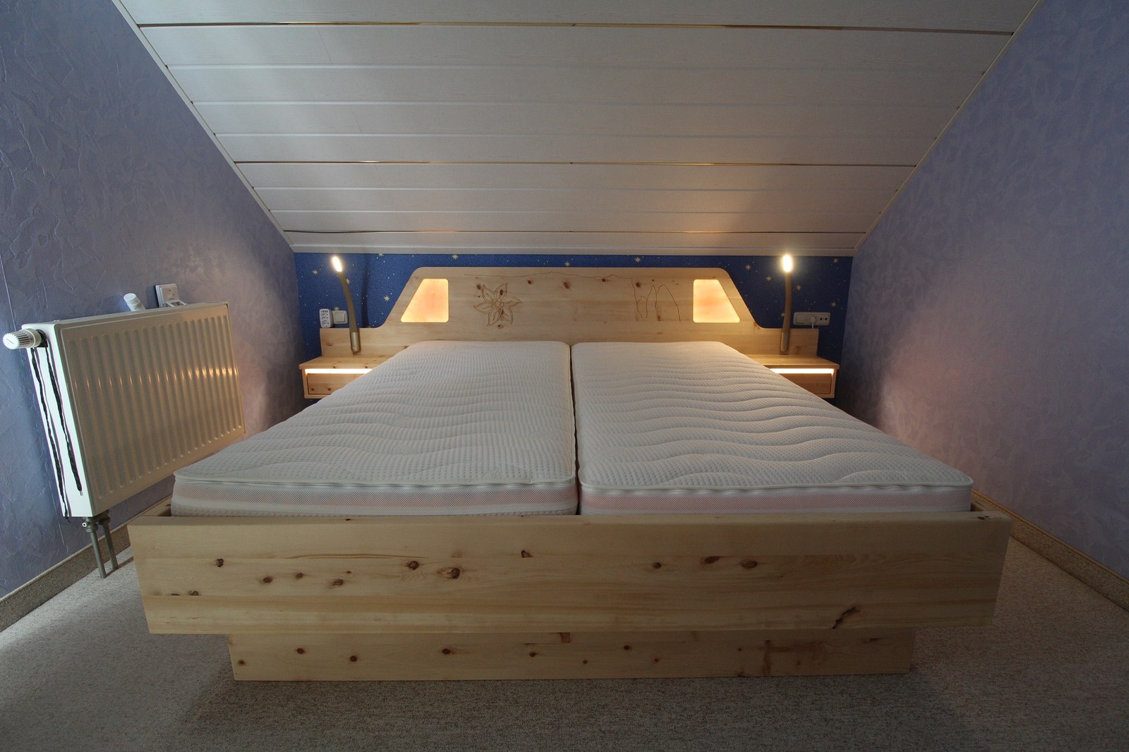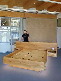 ein aufwändiges Doppelbett aus massiver Eiche mit handgezinkten Nachttischen, großen Bettschubkästen und schöner indirekter Beleuchtung, Oberfläche geölt