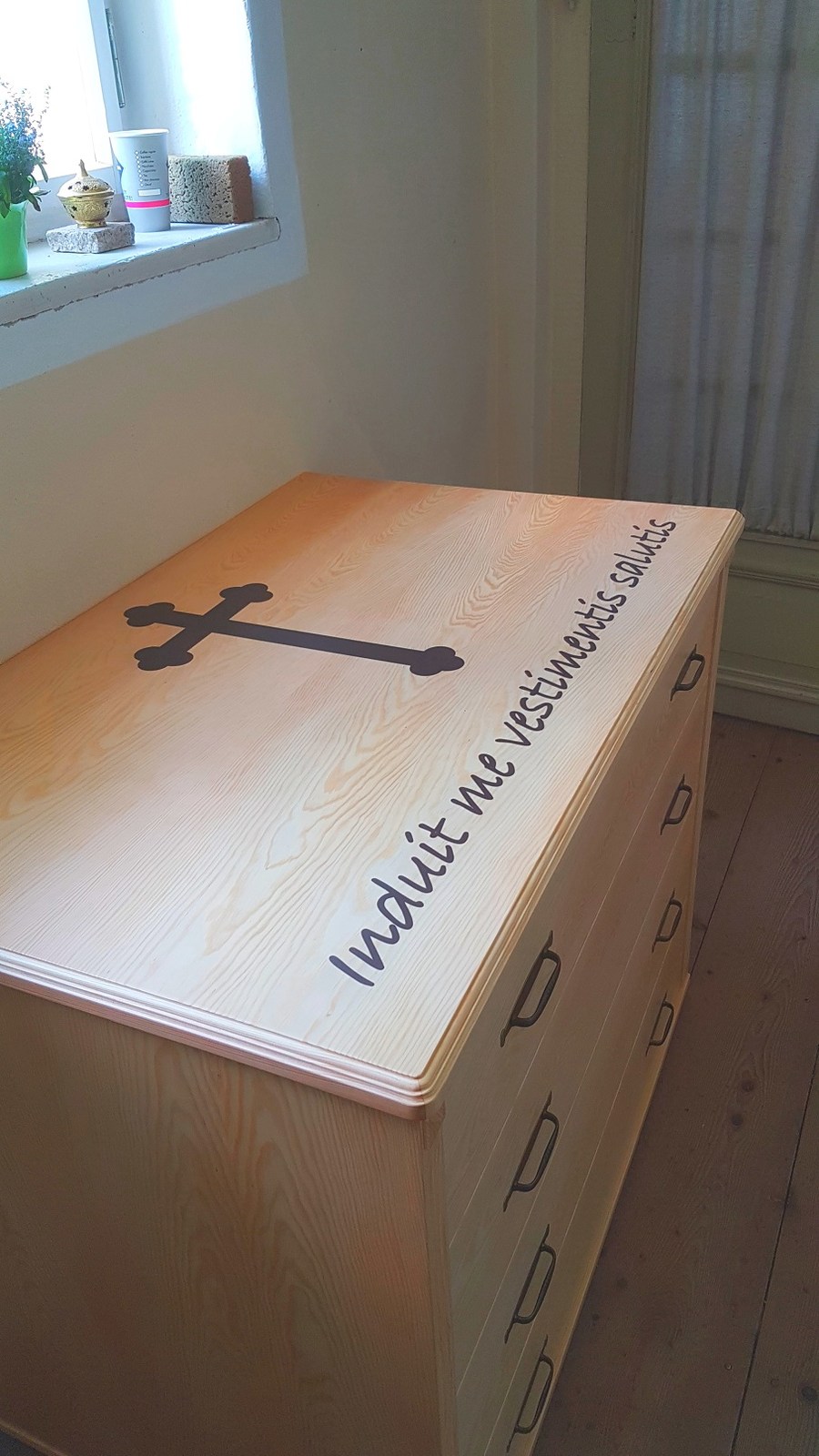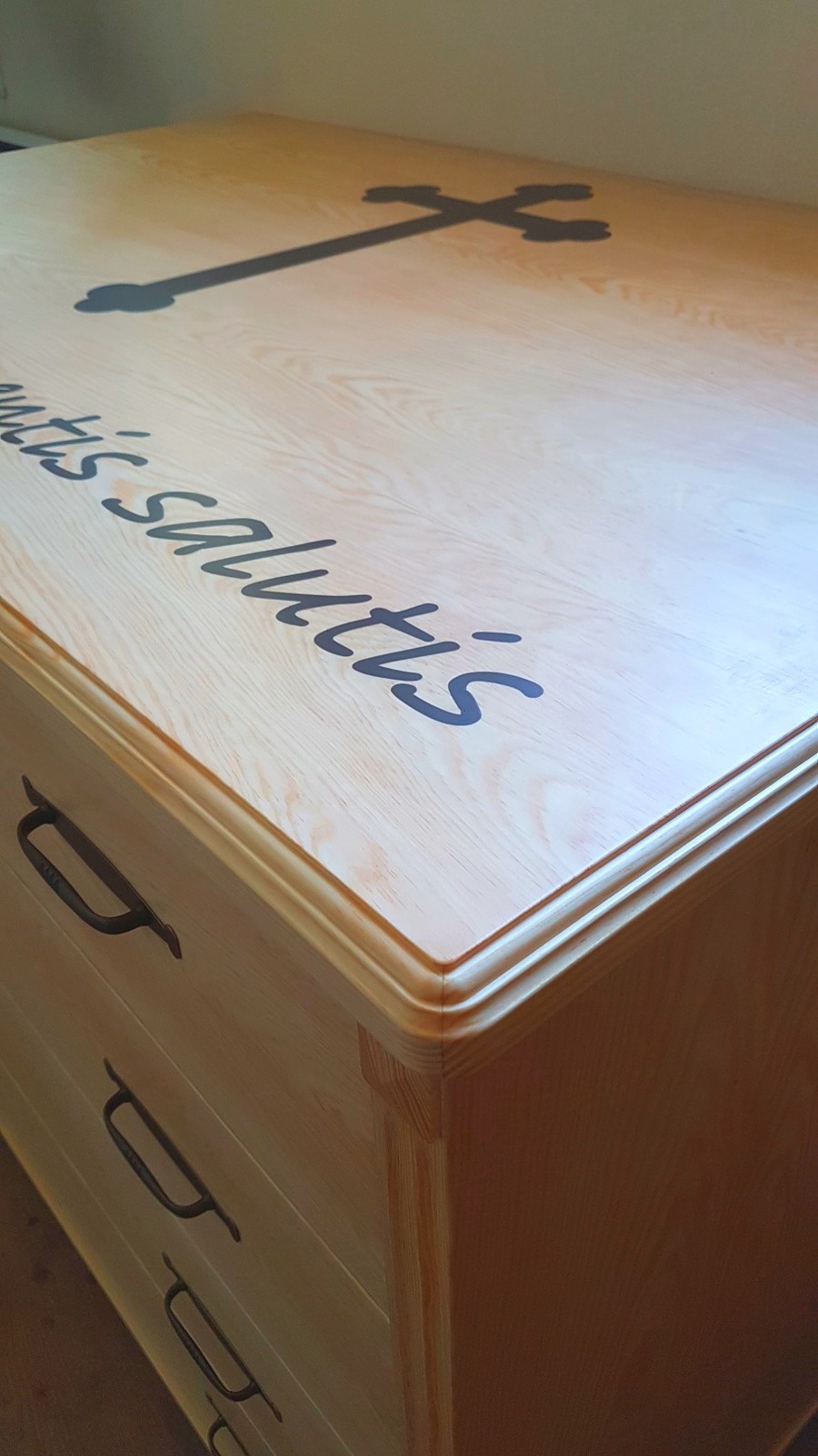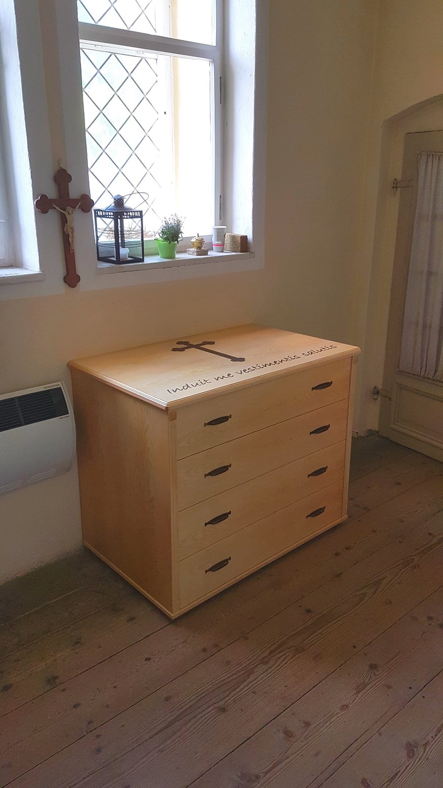 Schubkastenschrank für Gewänder und Umhänge in einer Kirche aus Kiefer-Furnier. Im Oberboden ein Kreuz und eine lateinische Schrift mit Epoxid-Harz ausgegossen.