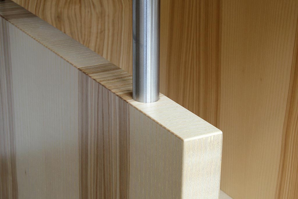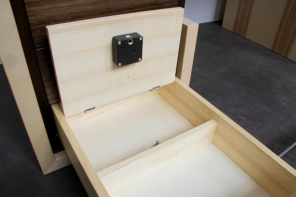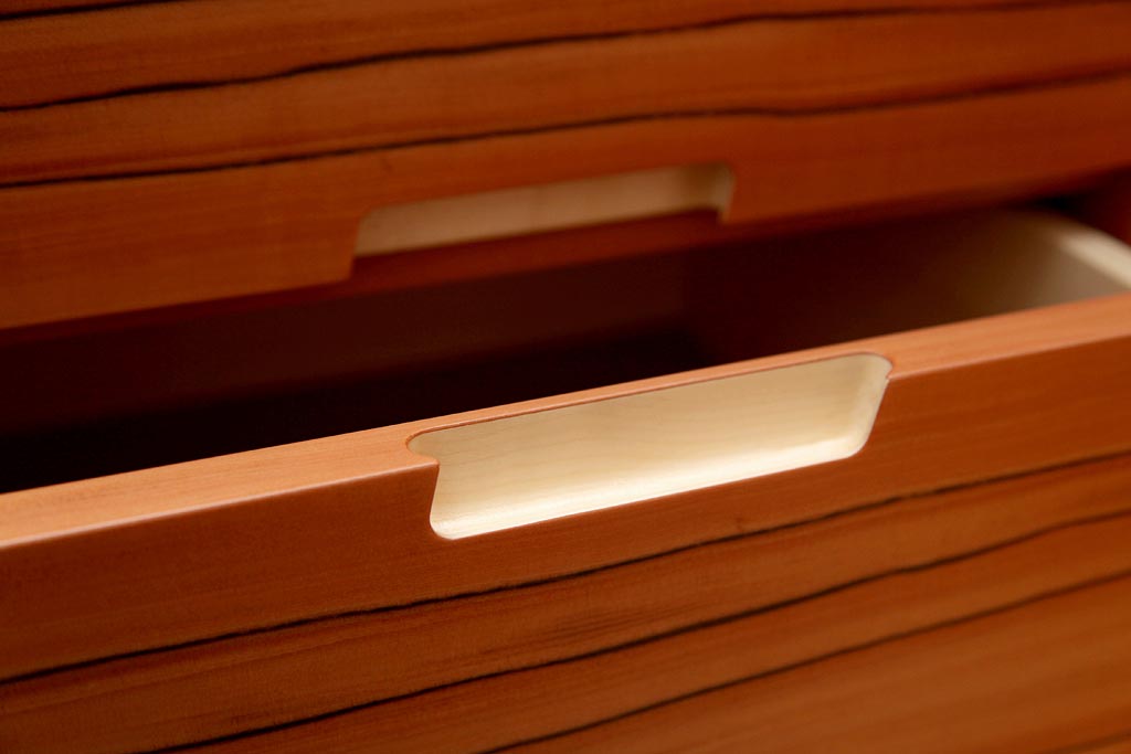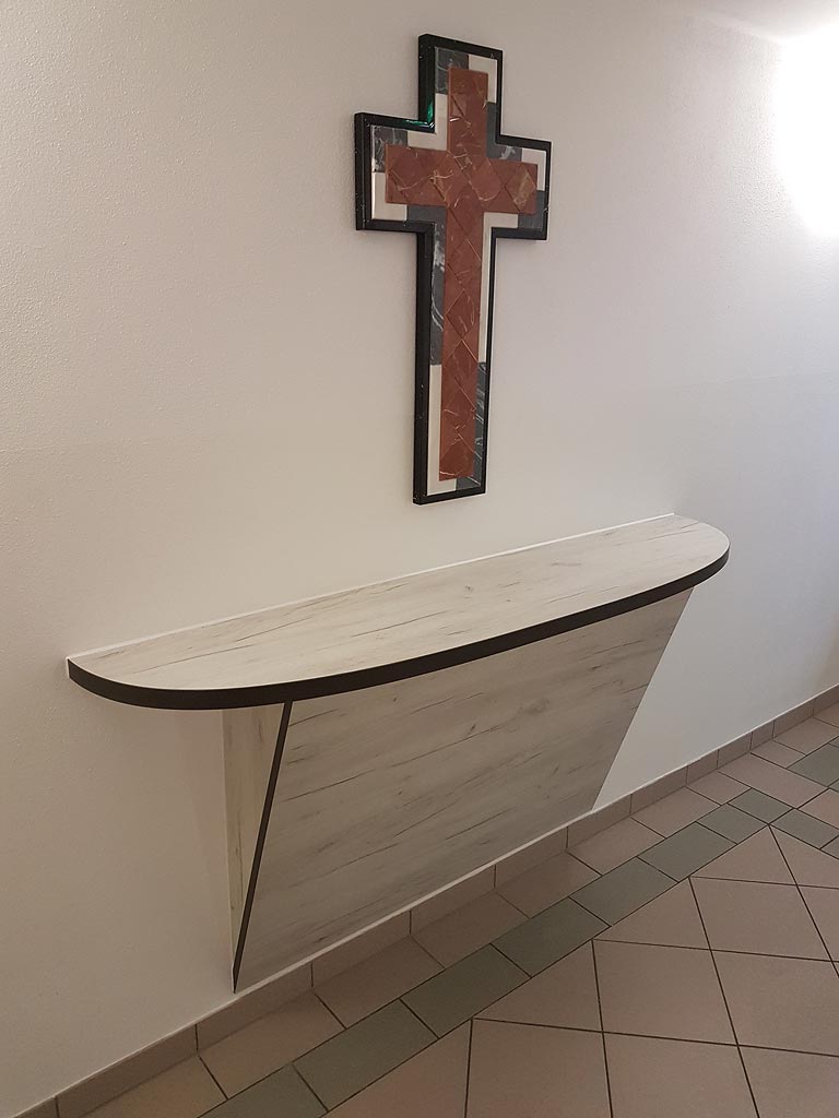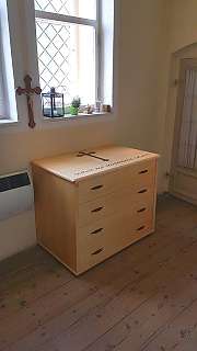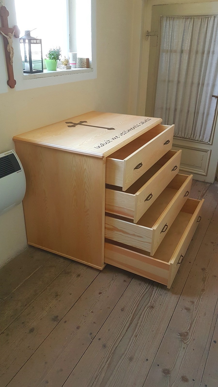 Schubkastenschrank für Gewänder und Umhänge in einer Kirche aus Kiefer-Furnier. Im Oberboden ein Kreuz und eine lateinische Schrift mit Epoxid-Harz ausgegossen.