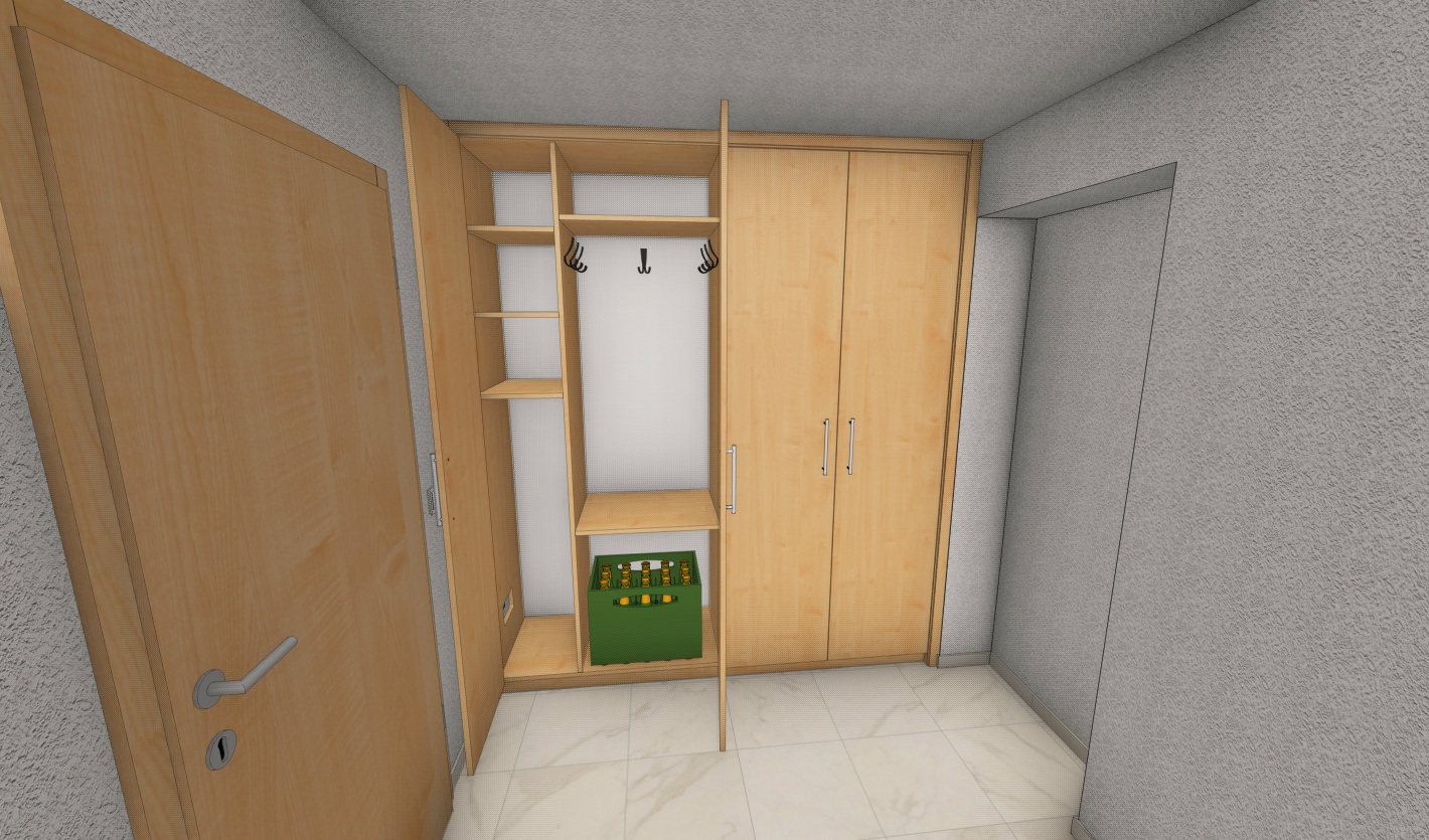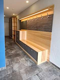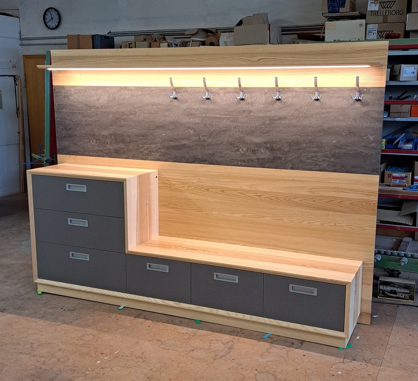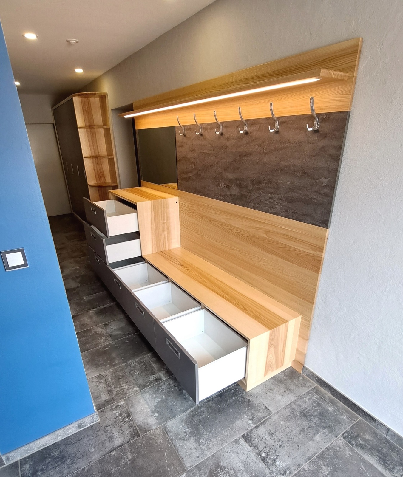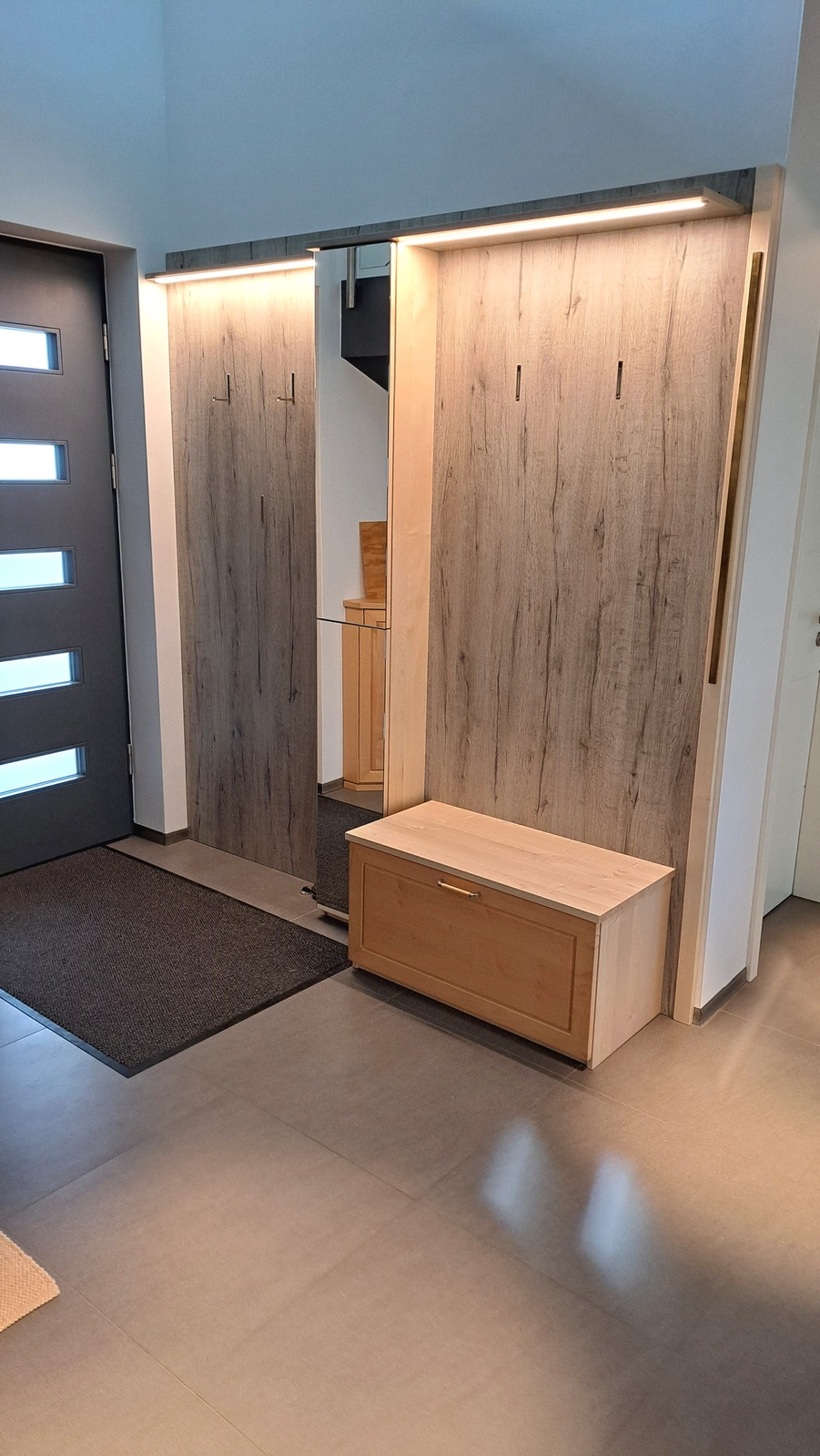 Fertigung einer Garderobe in einem Eigenheim, ein vorhandener Schrank wurde ebenso mit eingearbeitet