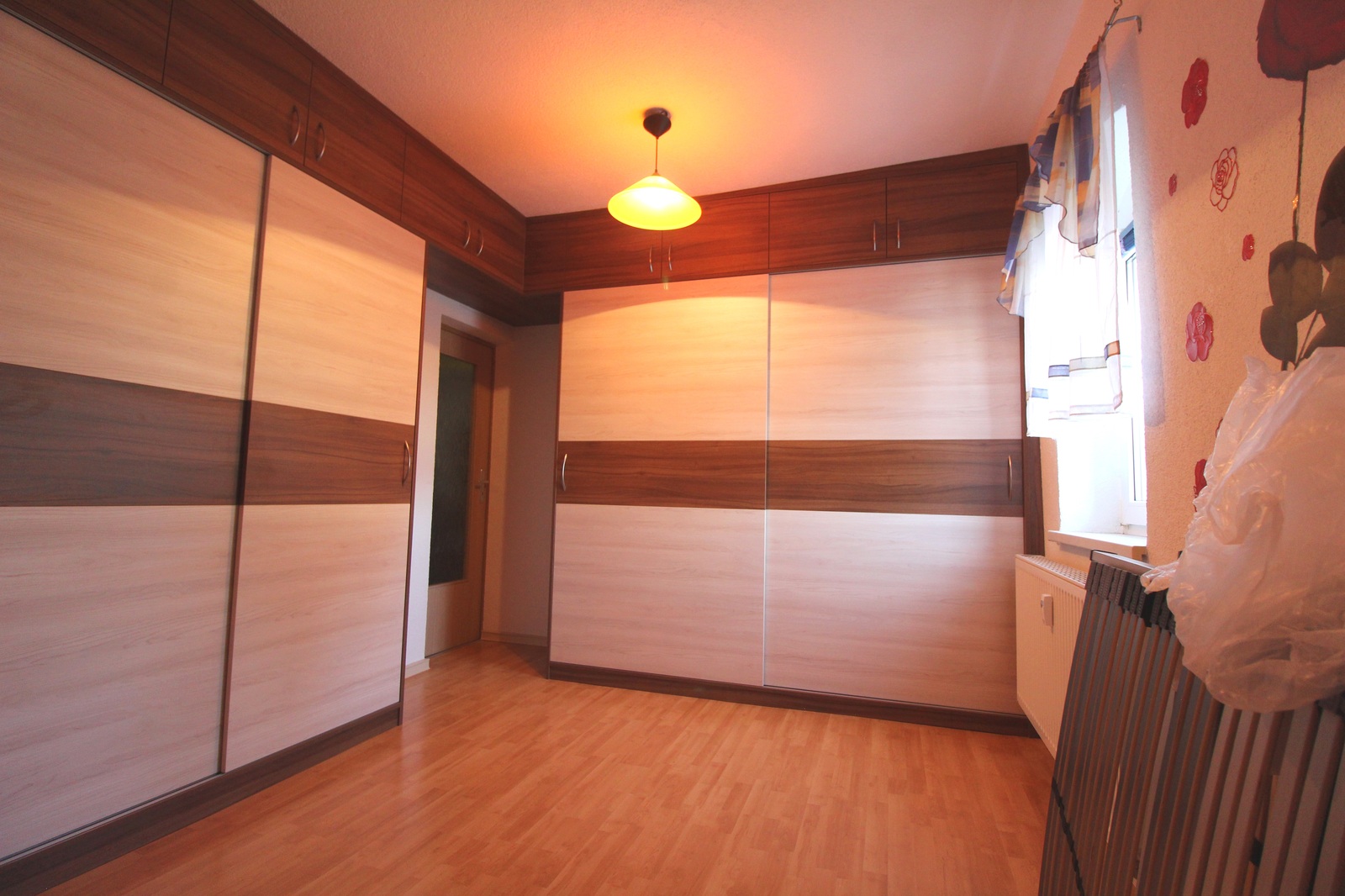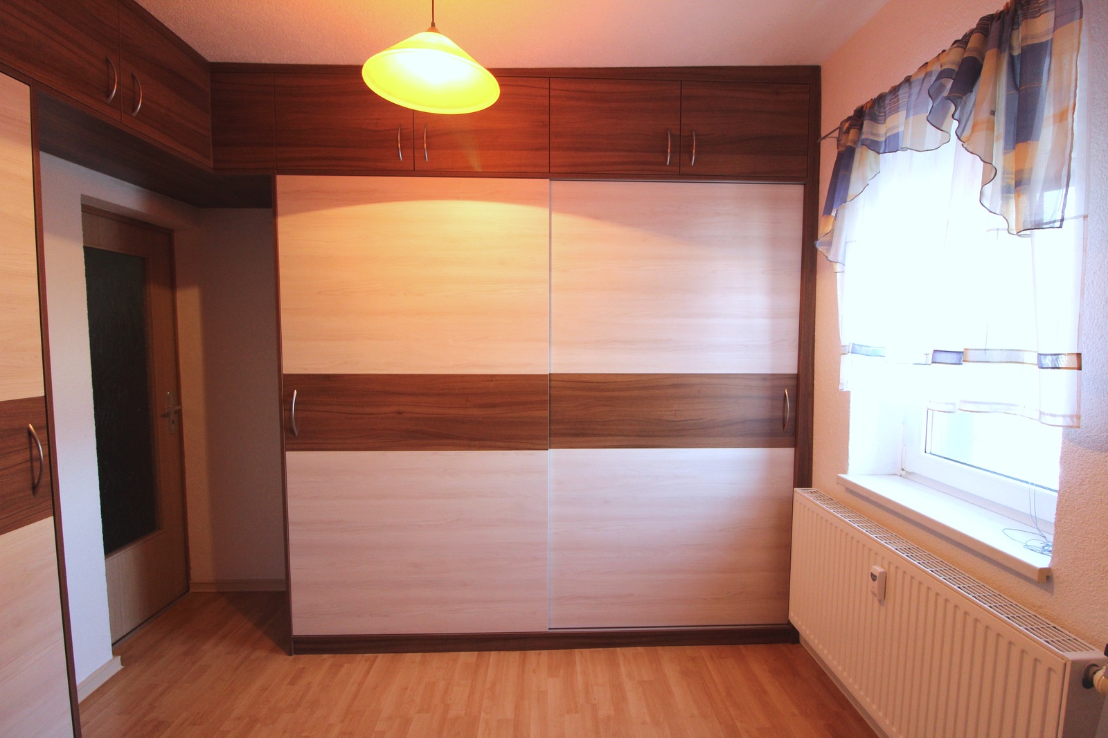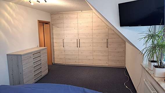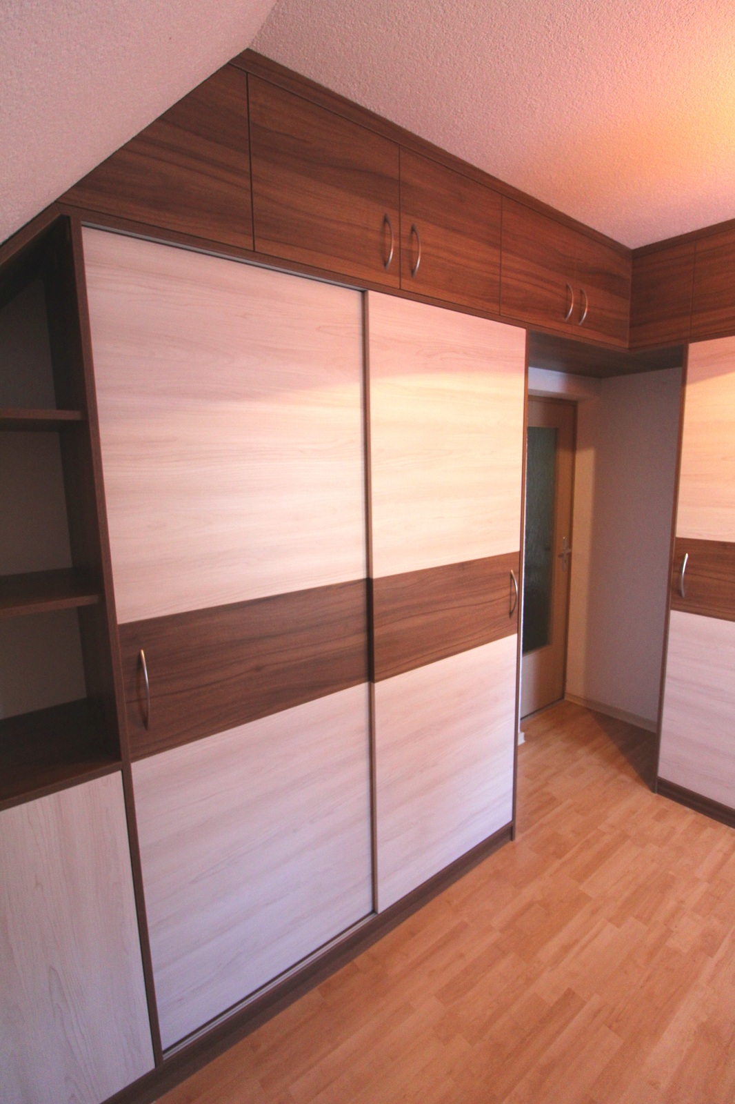 Schlafzimmer-Kleiderschränke mit großen Schiebetüren, an die Dachschräge angepasst - ebenso wurde der 4cm schiefe Fußboden eingearbeitet