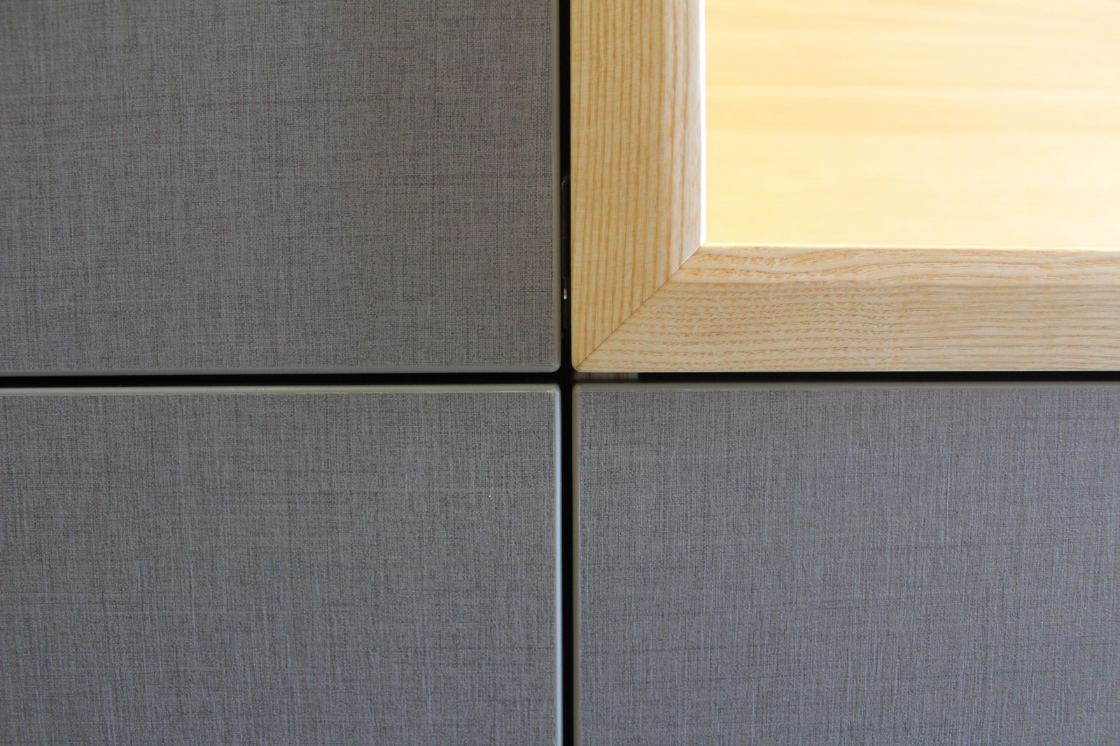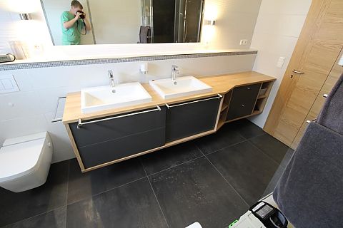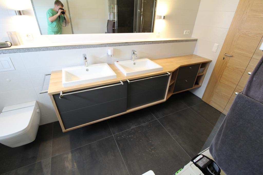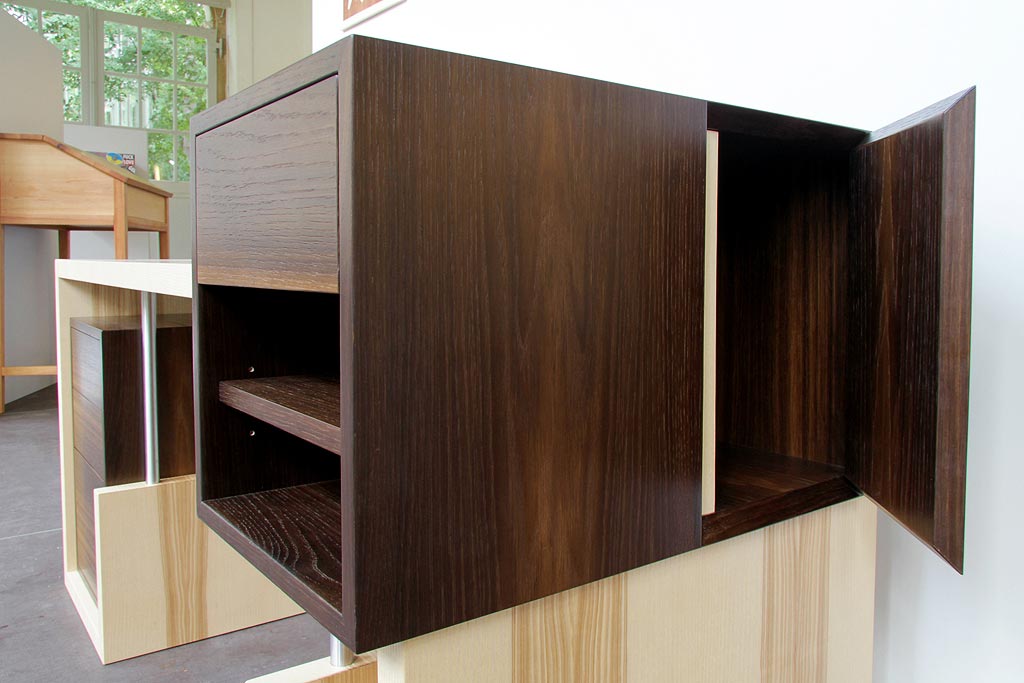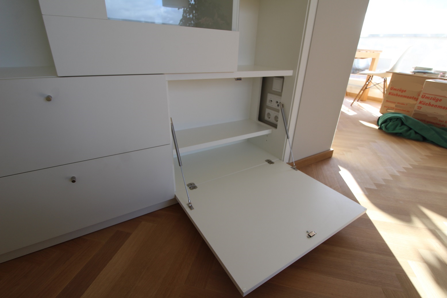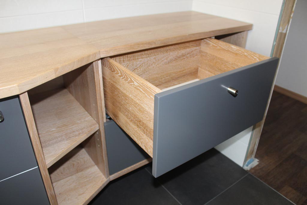 Fertigung eines großen Schrankes nach Architektenvorgabe, die Fronten erscheinen wie viele Schubkästen, der Schrank besteht aber auch aus 2 Türen und einem großen Auszug mit Laptop-Ablage, der für gelegentliche Schreibarbeiten fungieren soll. Die Abdeckplatte aus einer rustikalen Eiche, Oberfläche geölt