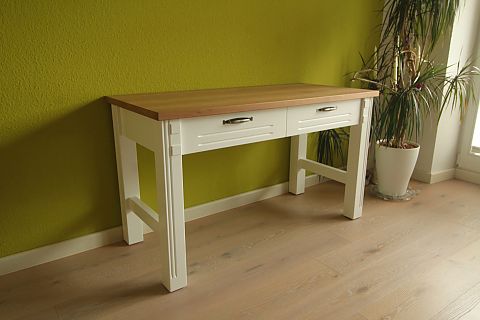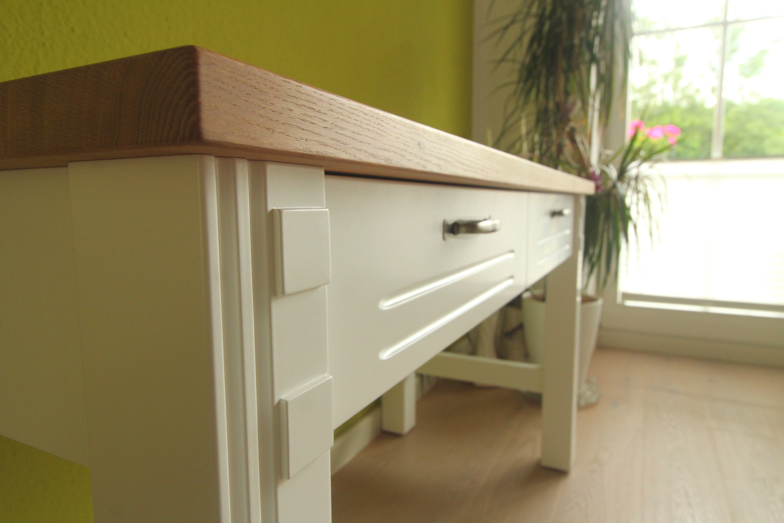 Einseitig ist ein Schubkasten integriert, in diesem kann die Ansteckplatte verstaut werden oder trägt diese - für 2 Plätze mehr am Tisch