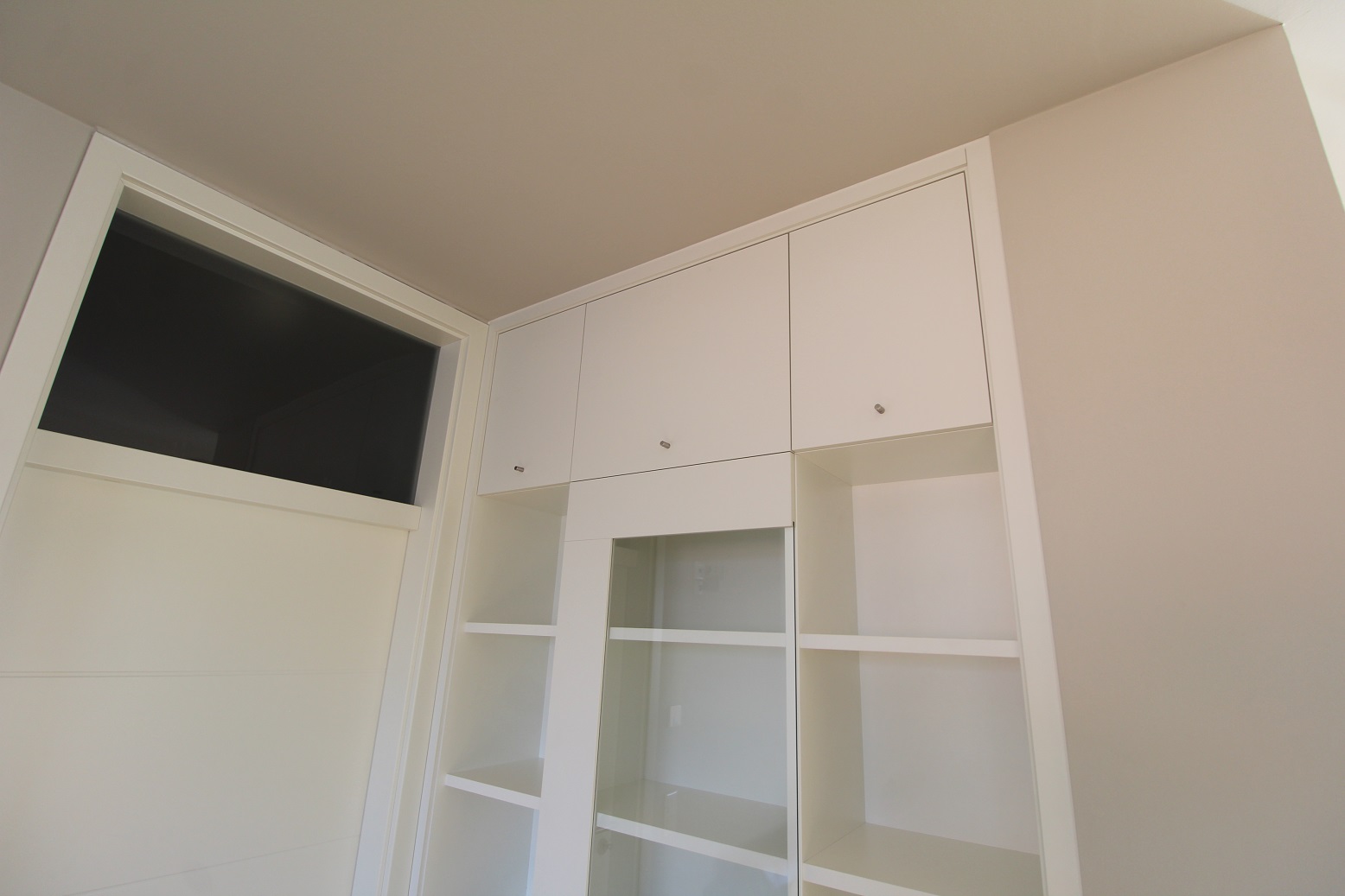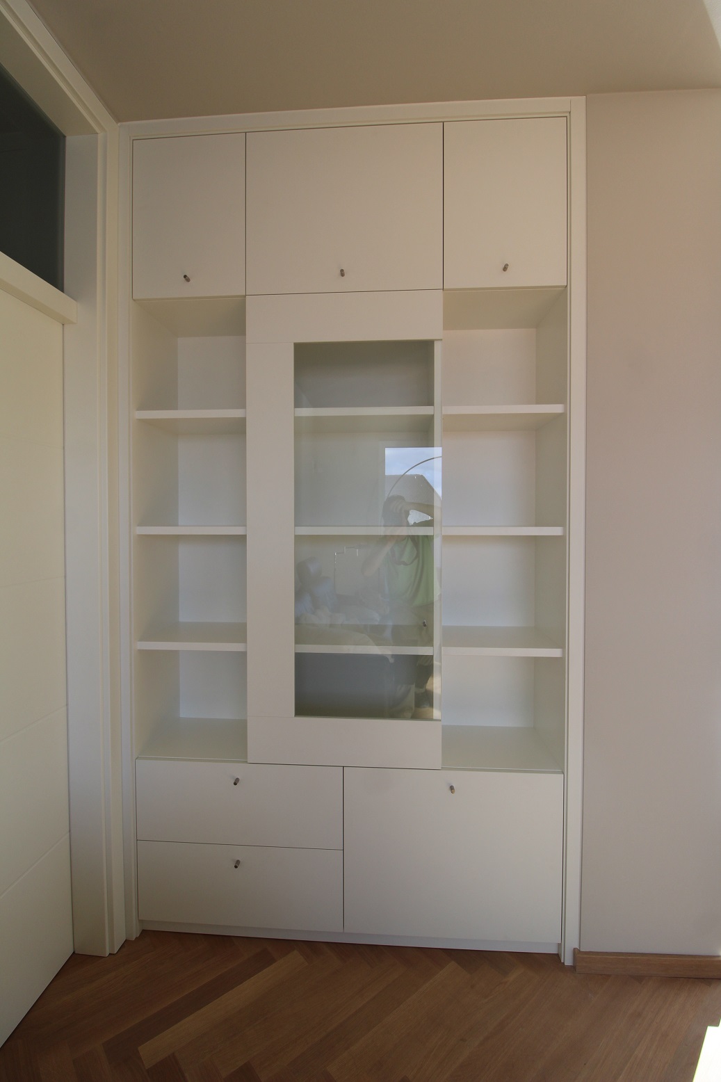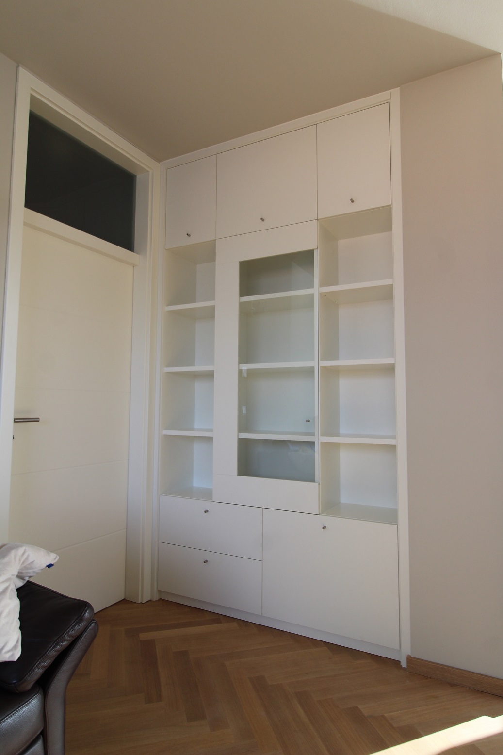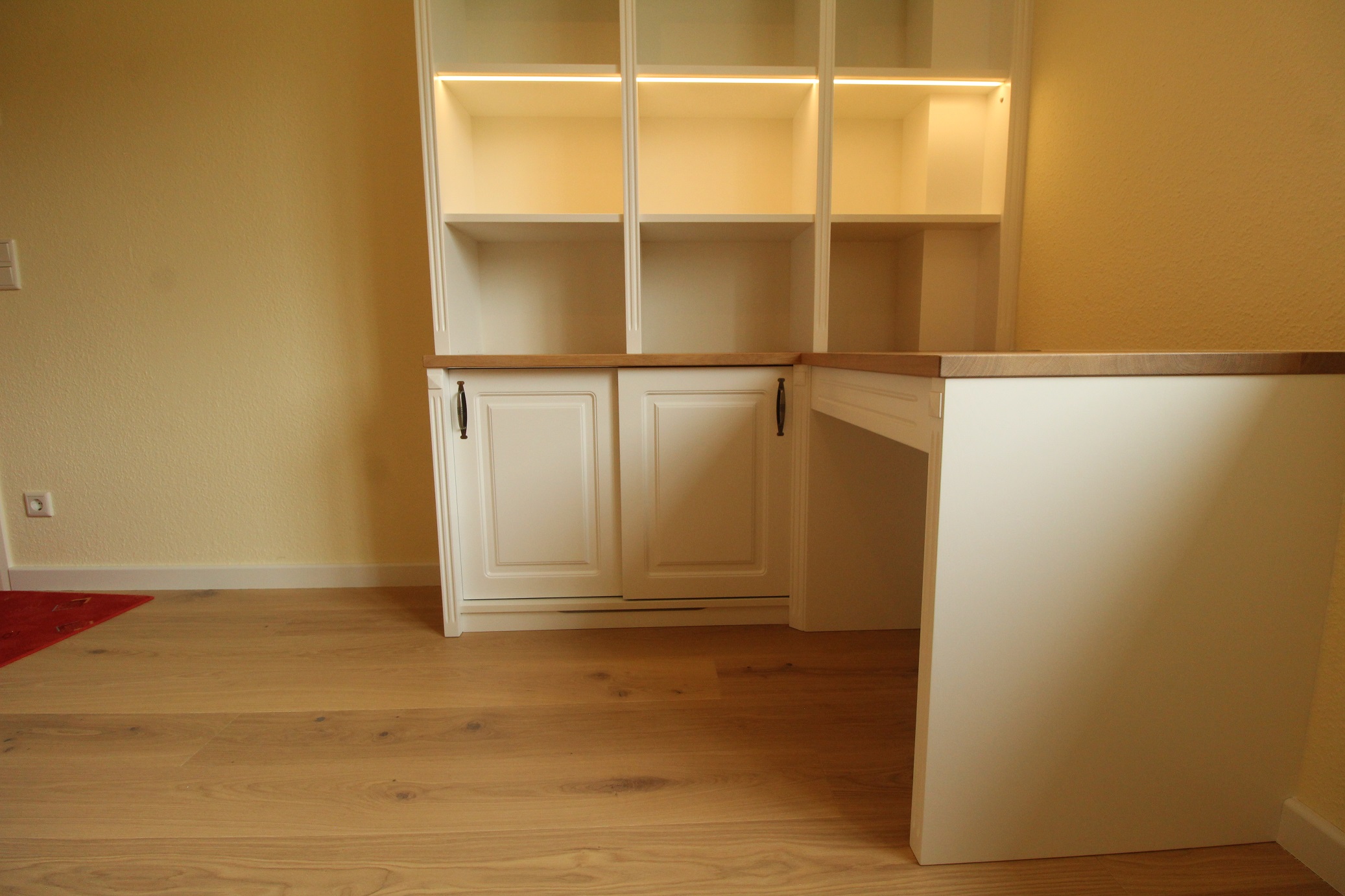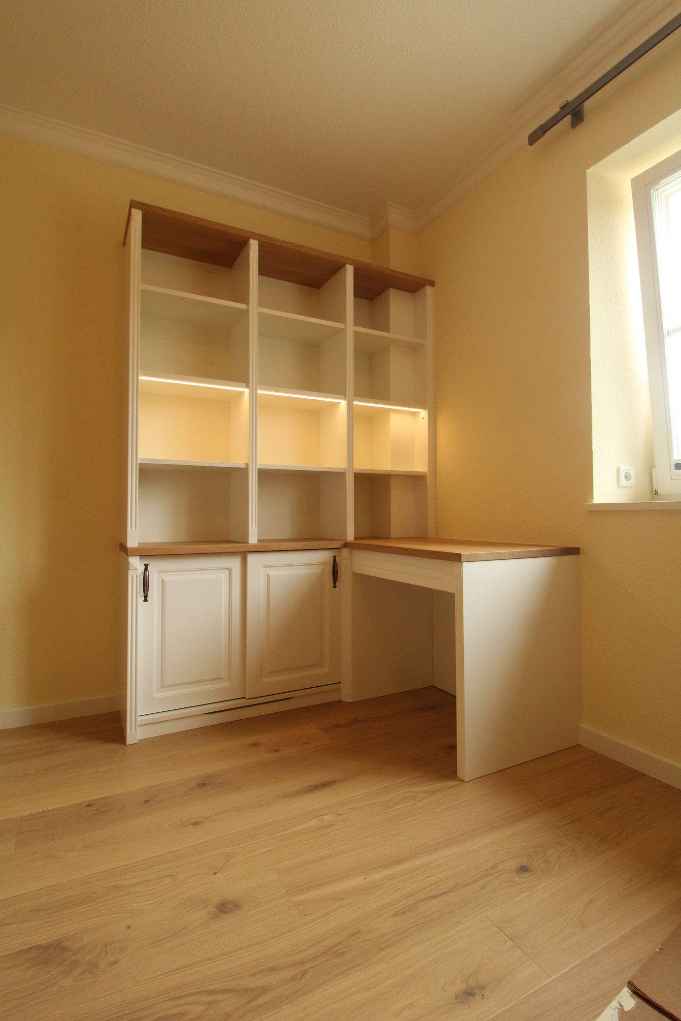 Ausbau eines Bücherregals mit Schiebetürenschrank und Schreibtischplatz aus weiß lackierter Esche und geölter Eiche