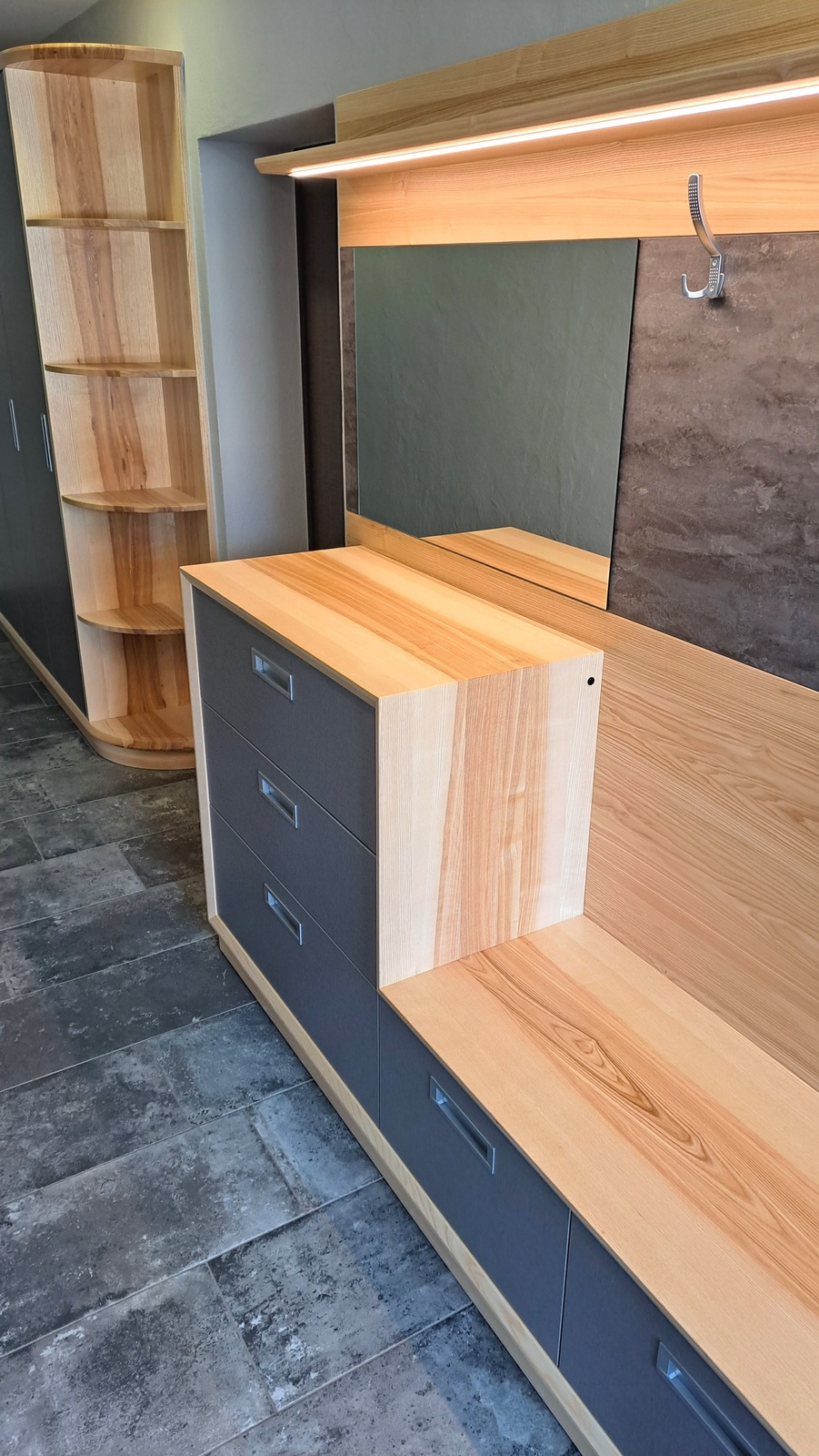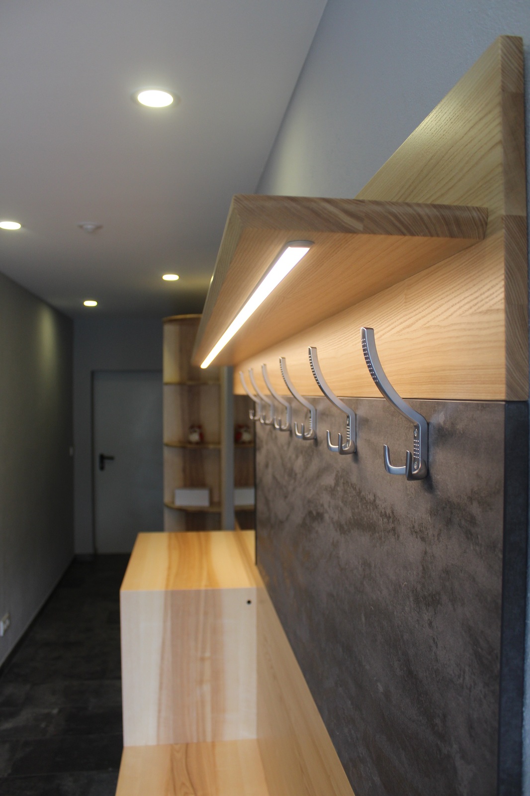 Modernes Flurmöbel mit Rückwandstreifen in Betonoptik und Beleuchtung sowie ein Schuhschrank, beides aus massiver Kern-Esche