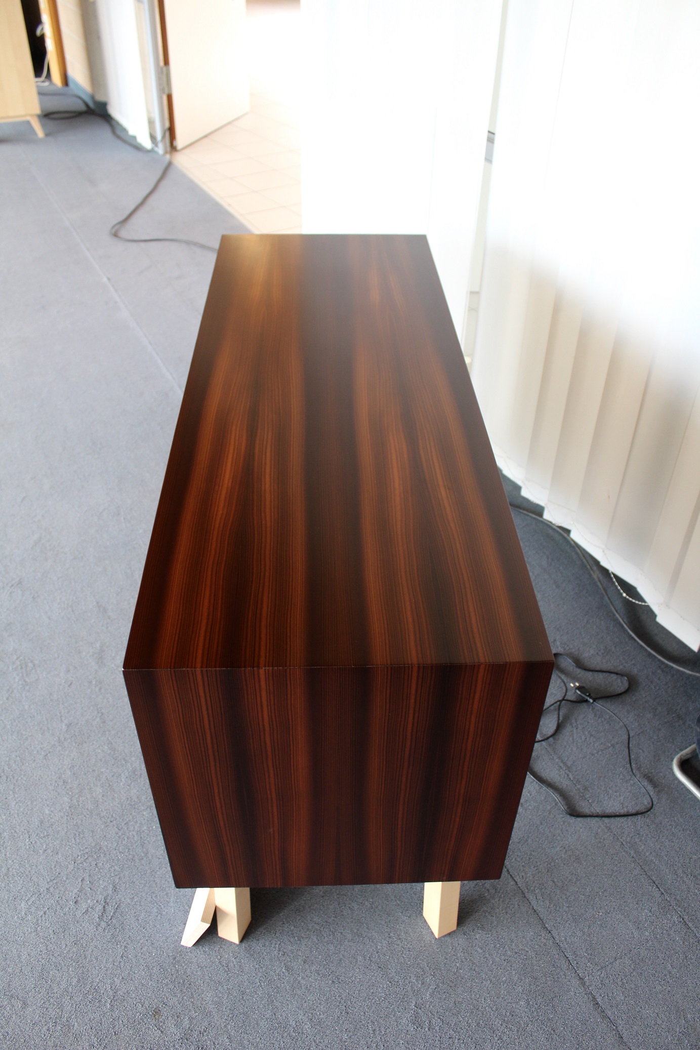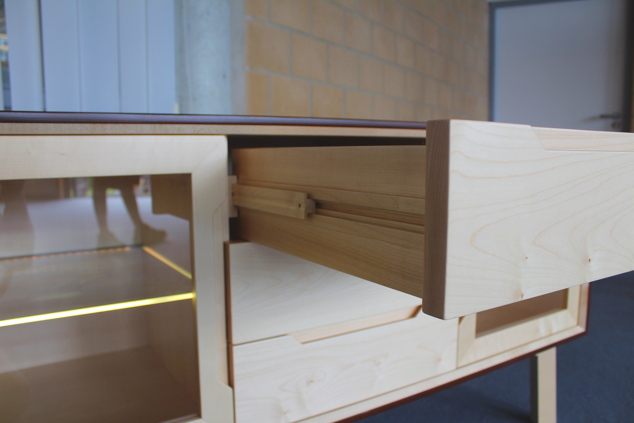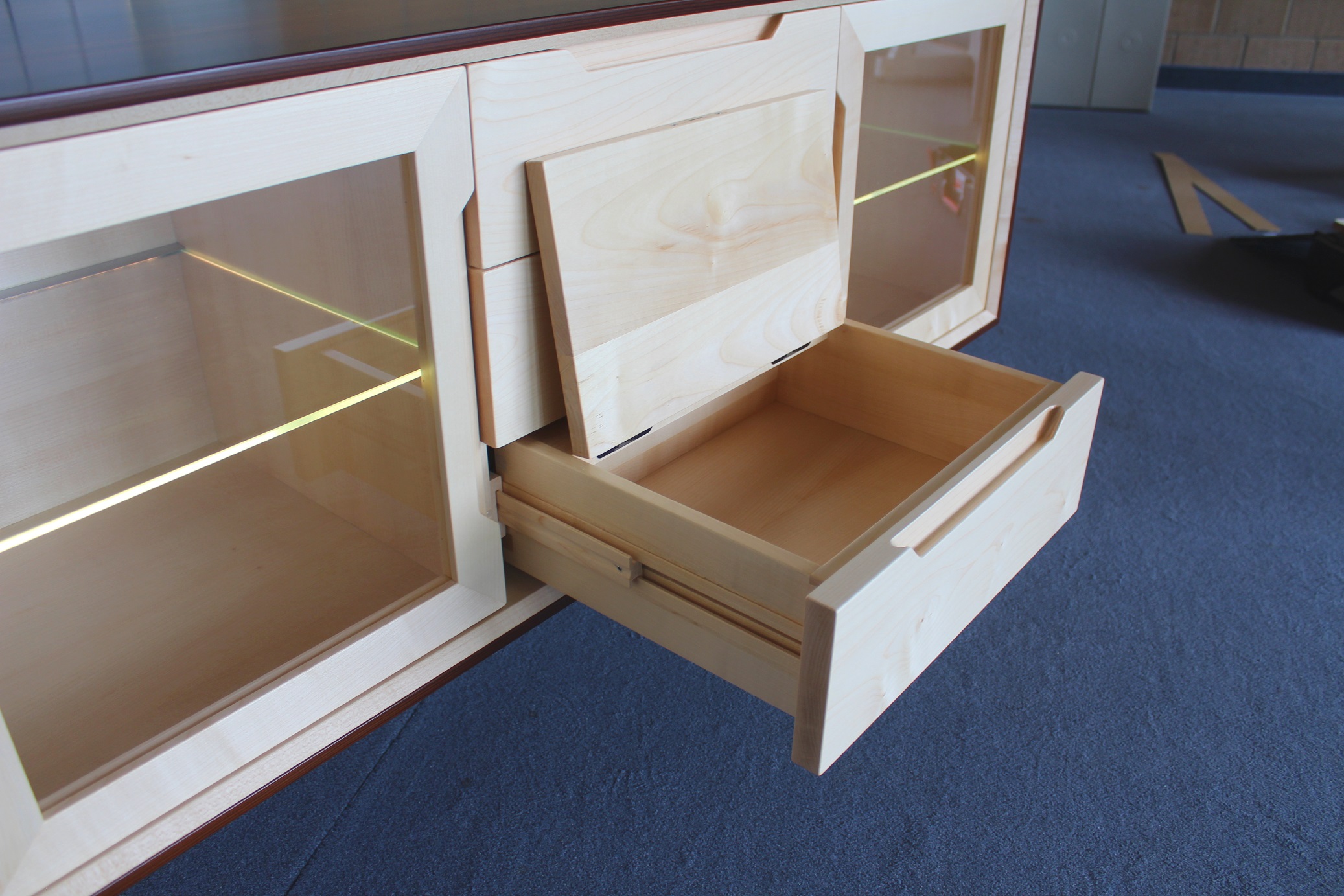 Fertigung eines Unterschrankes nach historischem Vorbild aus gebeiztem Spiegelahorn, das Innenleben mit Mahagoni furniert