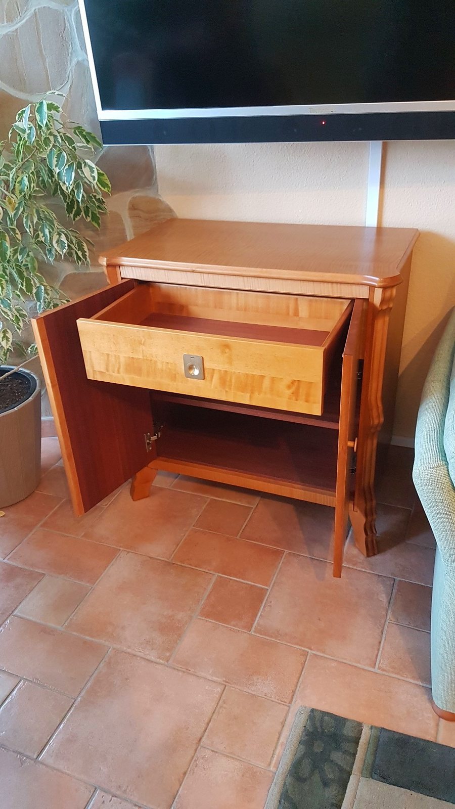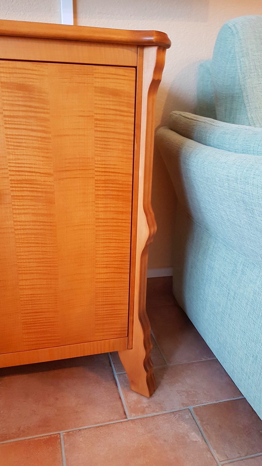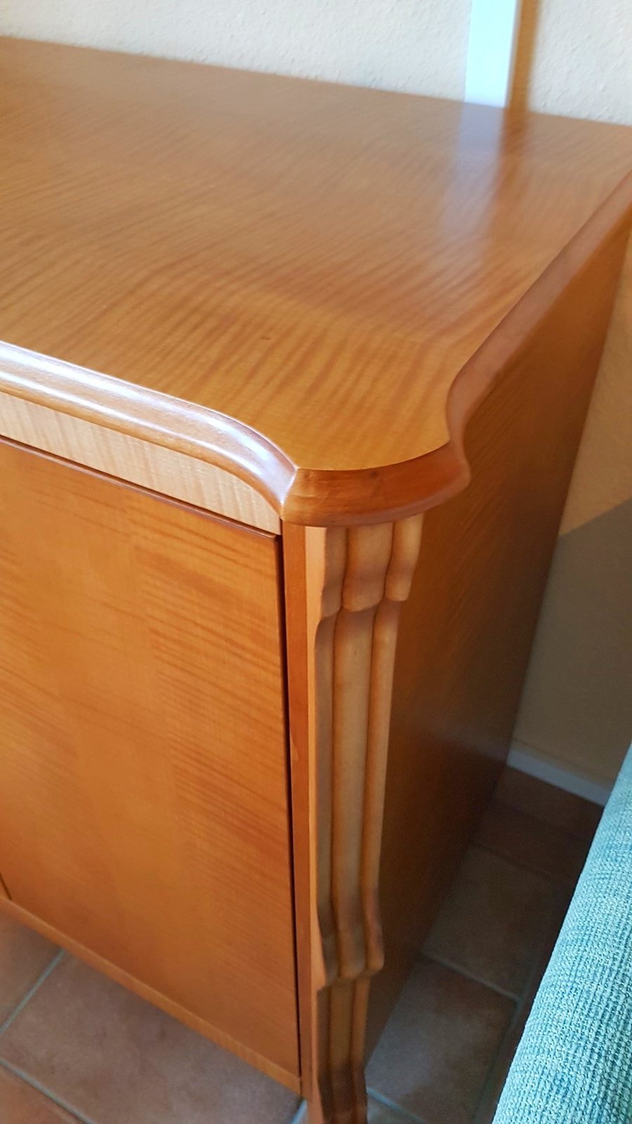 Fertigung eines Unterschrankes nach historischem Vorbild aus gebeiztem Spiegelahorn, das Innenleben mit Mahagoni furniert