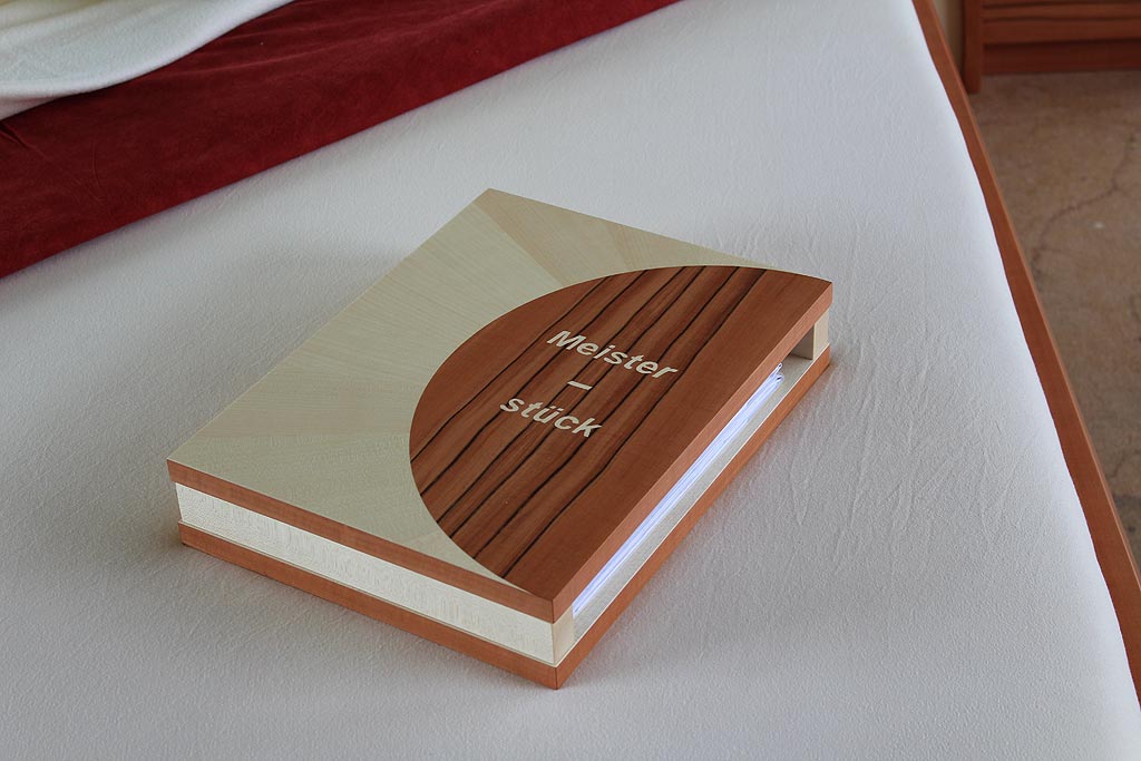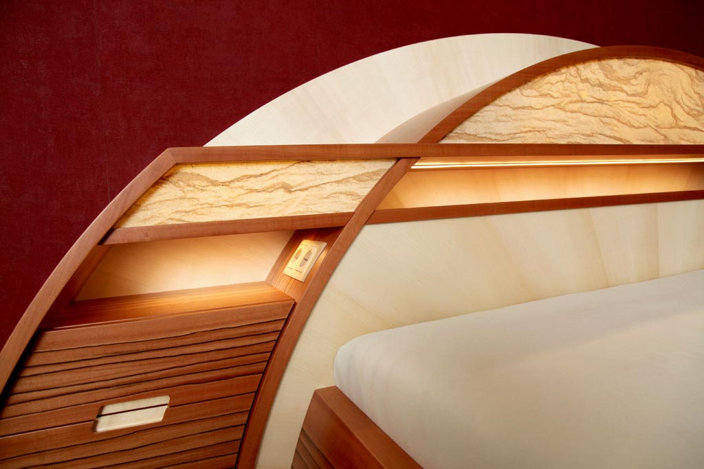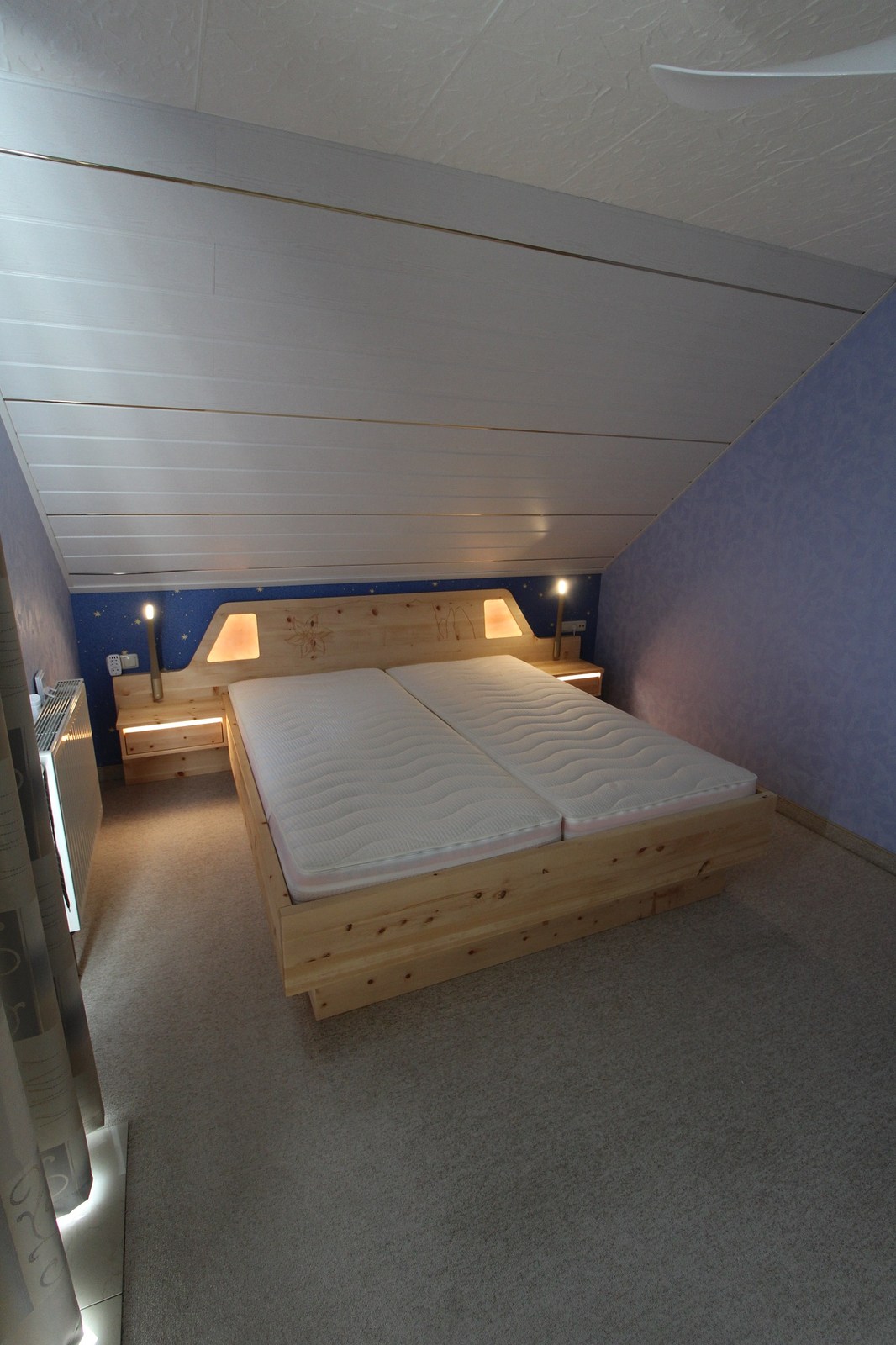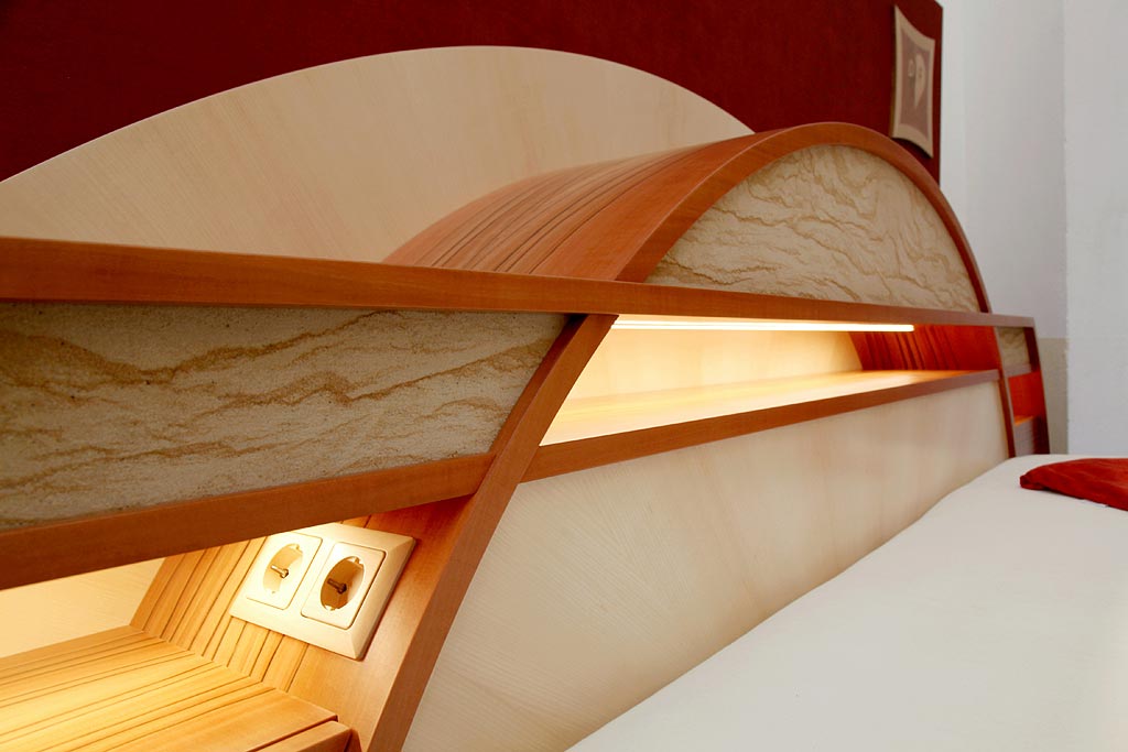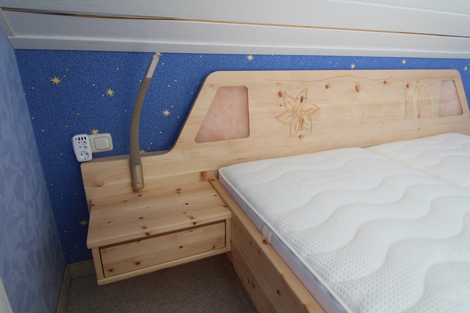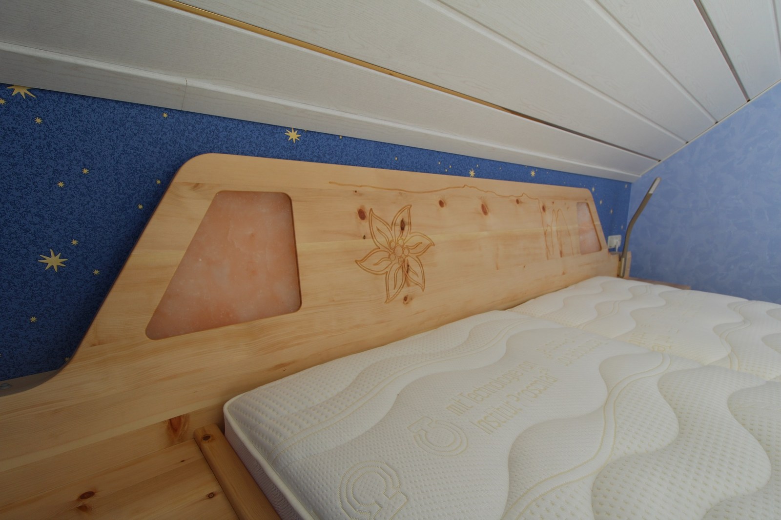 Ein Bett in geölter Zirbe mit hinterleuchtetem Salzstein, Schubkastenbeleuchtung sowie Silhouette einer Bergkette in den Alpen und eine Edelweiß-Blüte