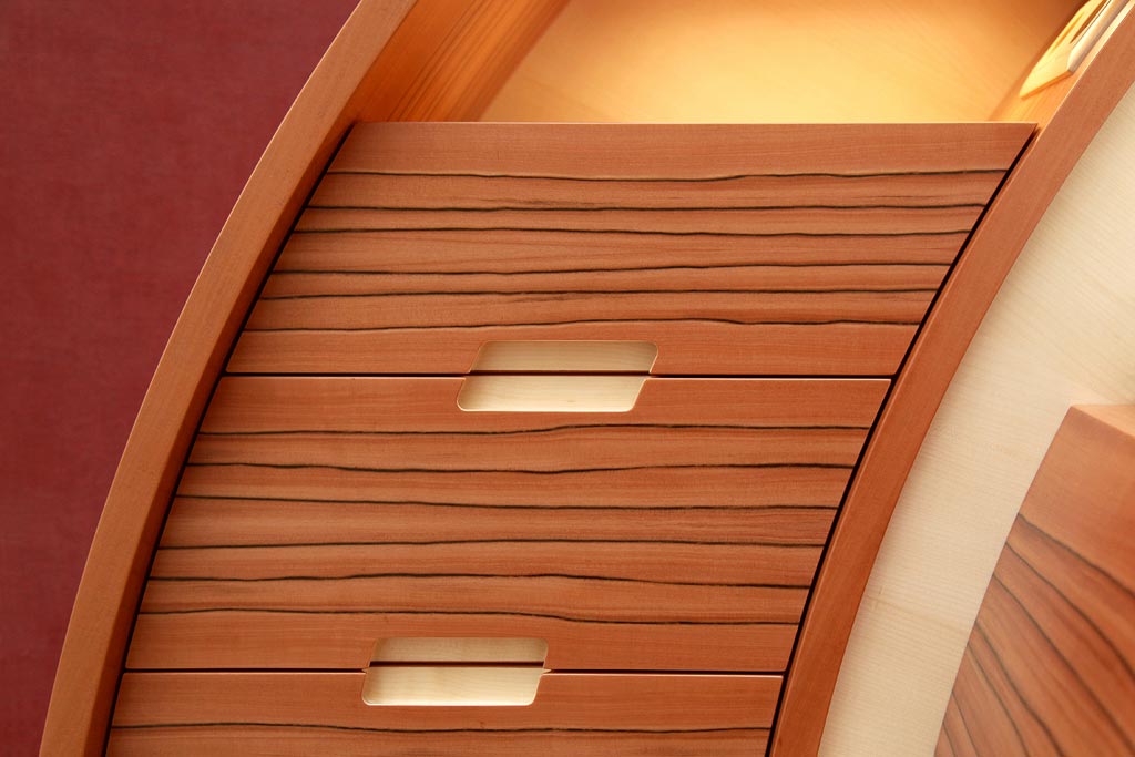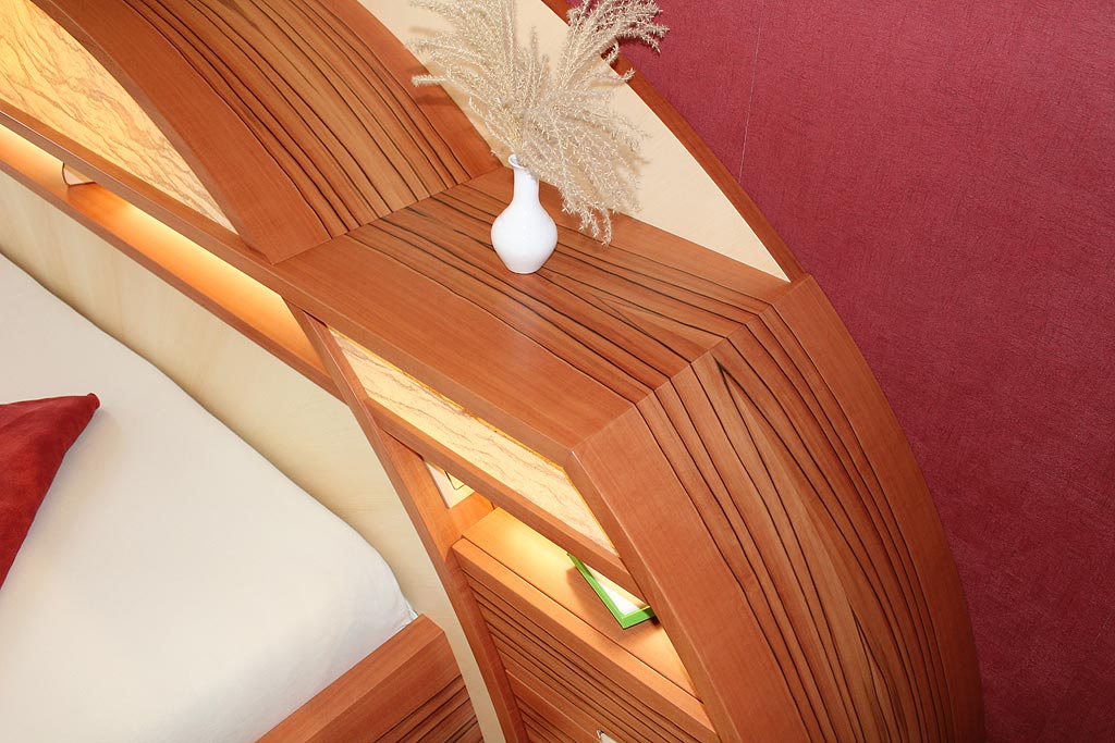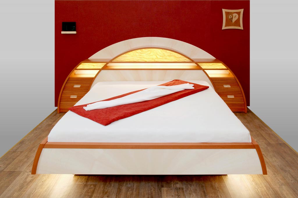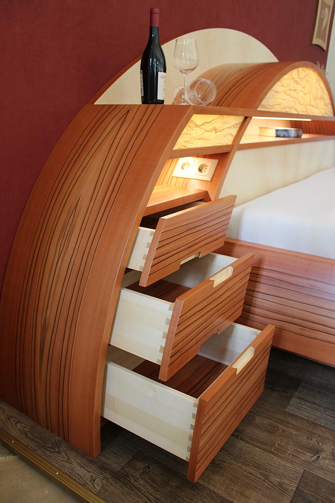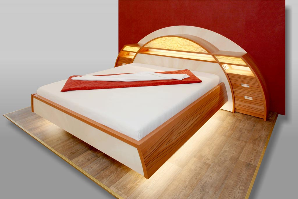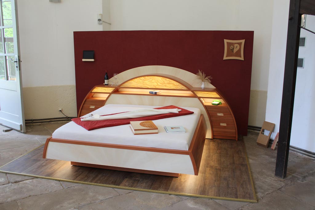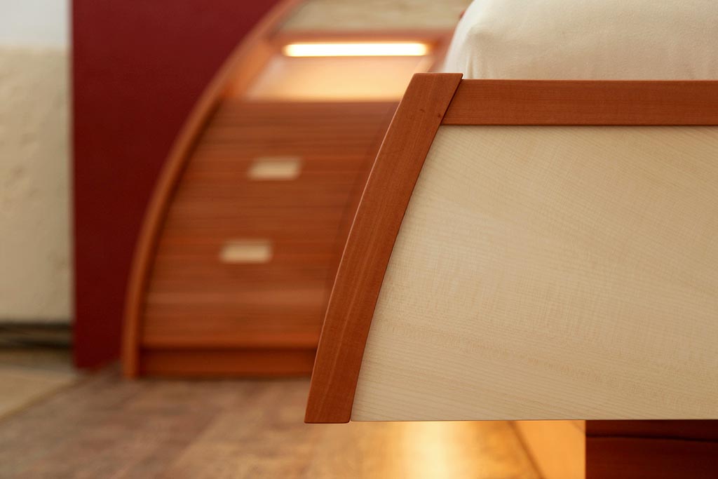 Bett in Ahorn und indischem Apfelbaum furniert,