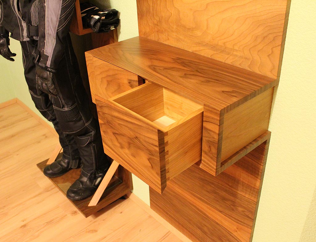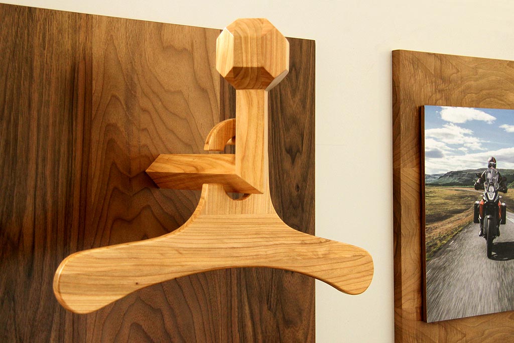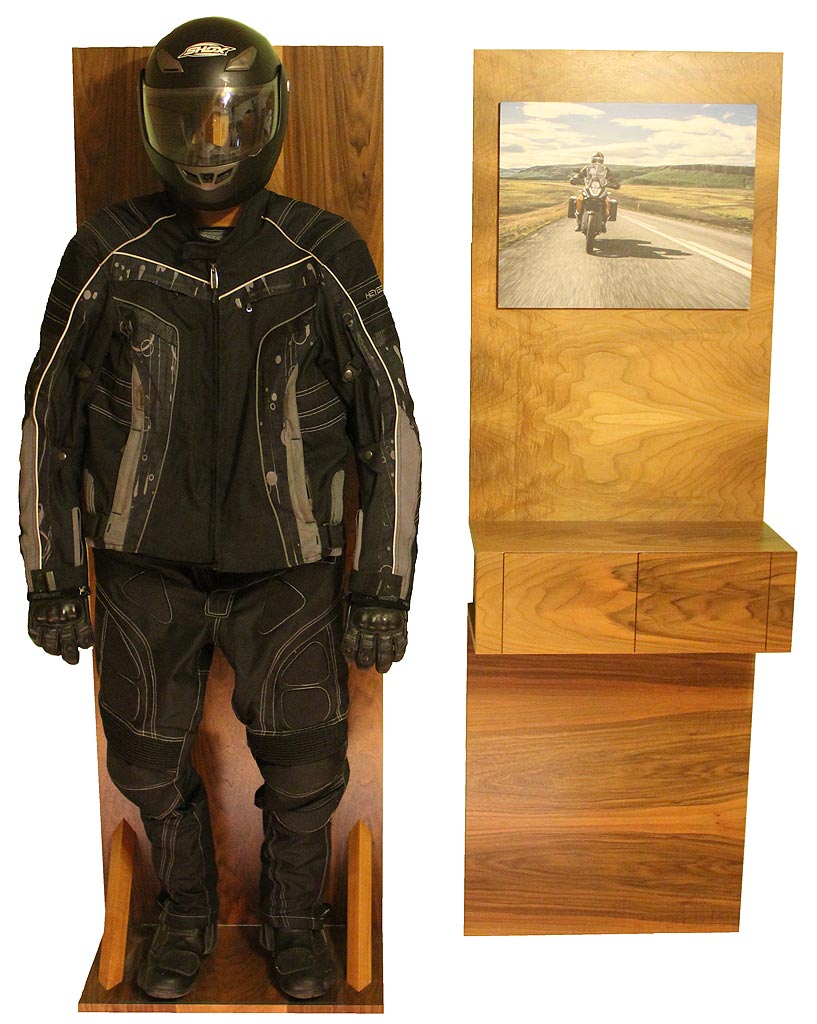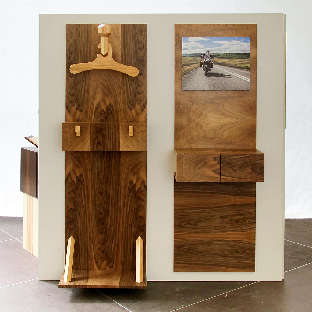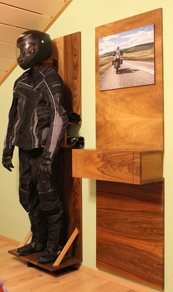 eine Garderobe für Motorradkleidung, so aufgehangen als würde ein Mensch da stehen, Nussbaum furniert